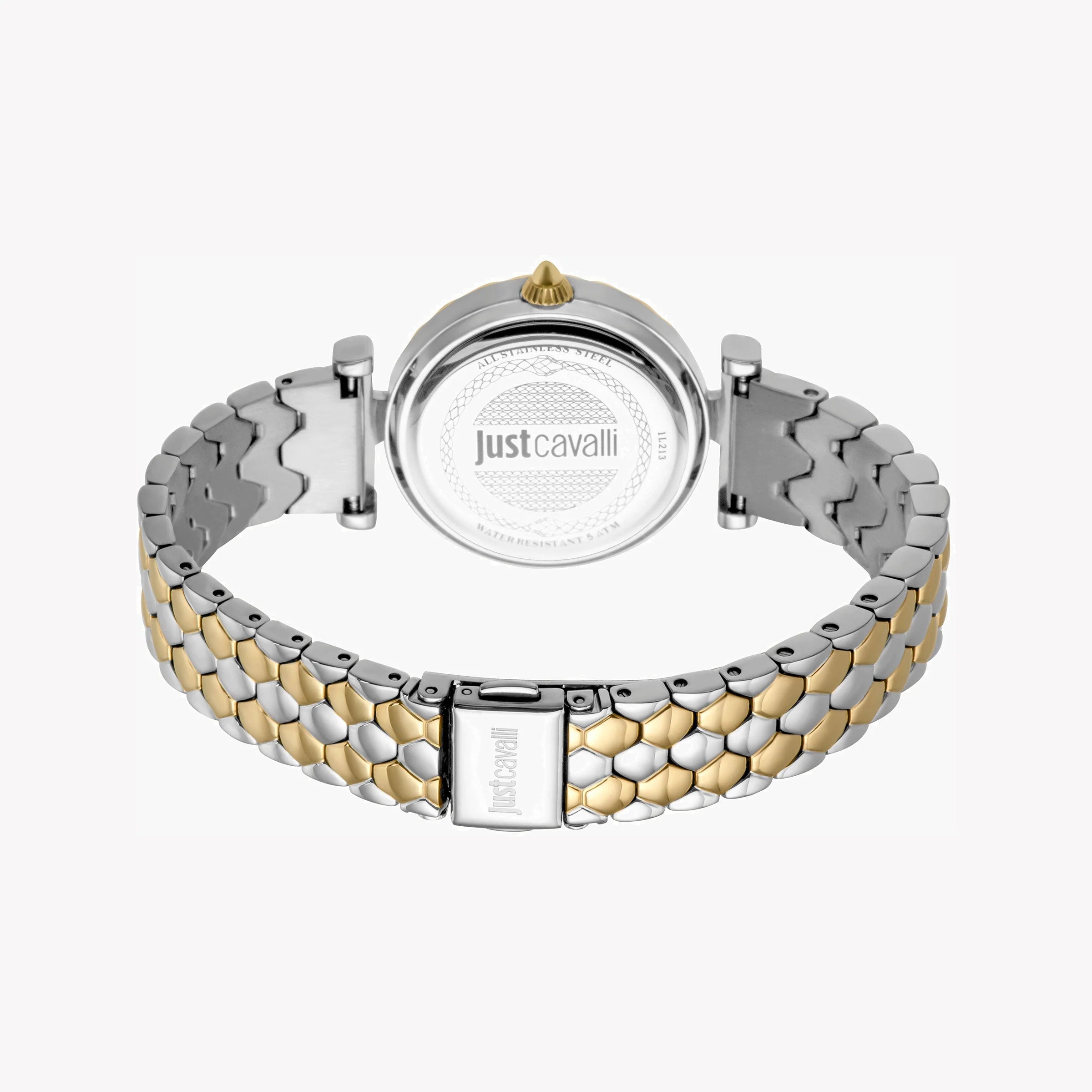 JUST CAVALLI Damenuhr mit silber- und roségoldenem Edelstahlgehäuse und silber- und goldfarbenem Edelstahlarmband