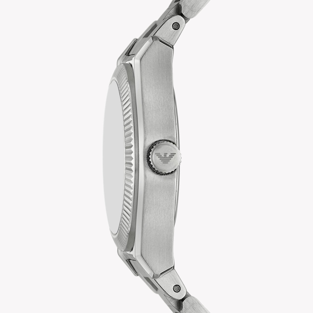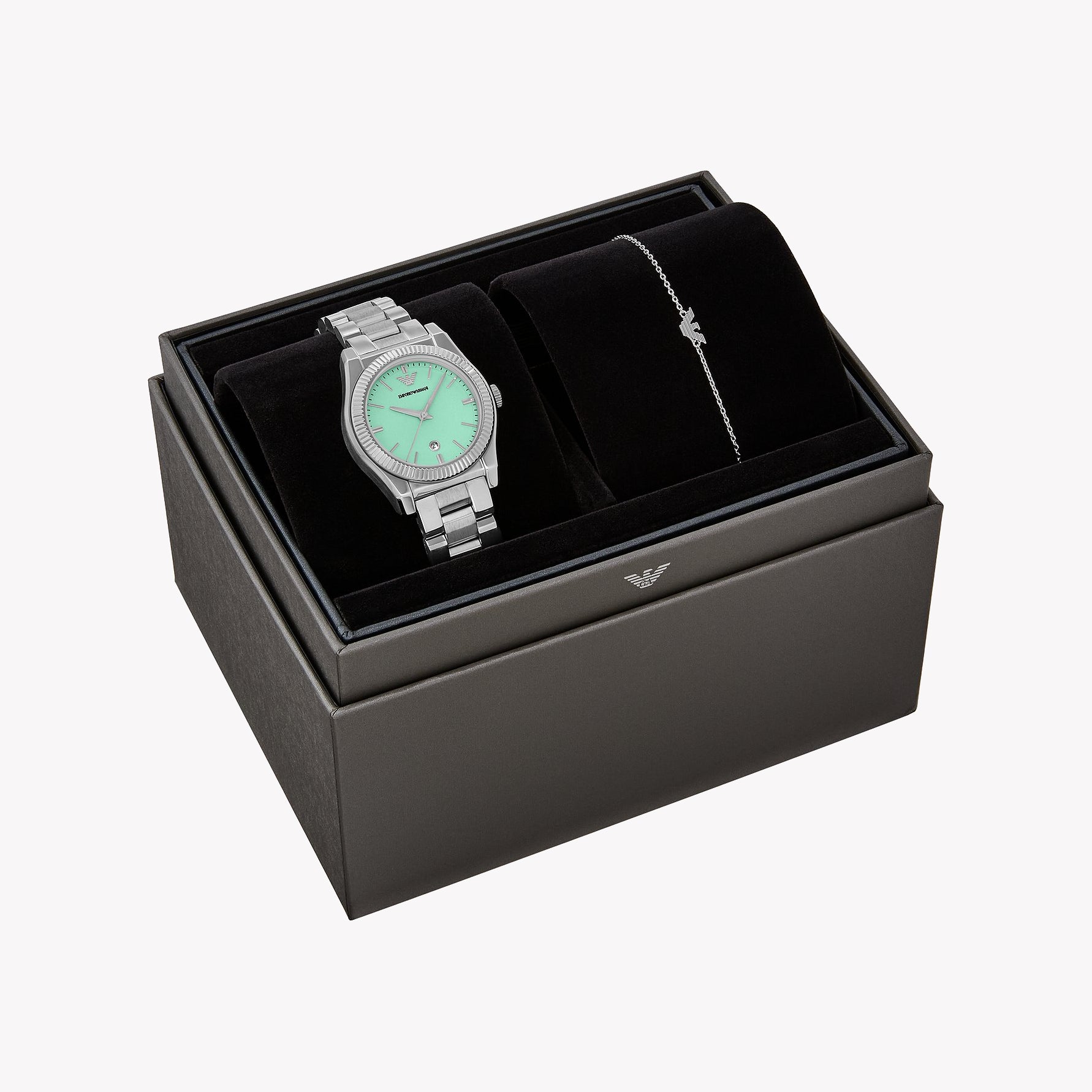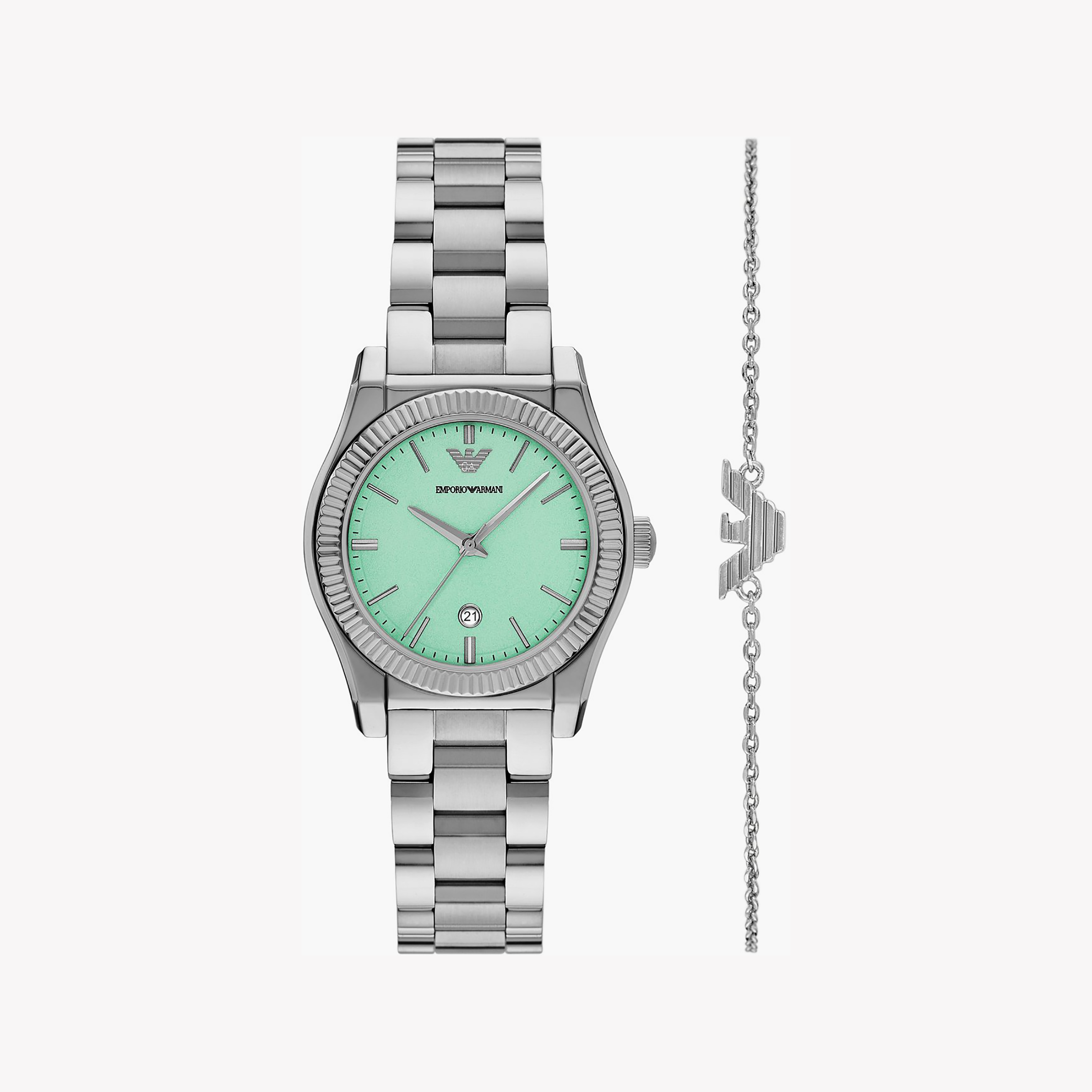 Embrace sophistication with the Emporio Armani Women's Silver Stainless Steel Watch - Model AR80074SET. This elegant timepiece boasts a dynamic green dial, 32mm case, and 5 ATM water resistance, perfect for the modern woman's style.