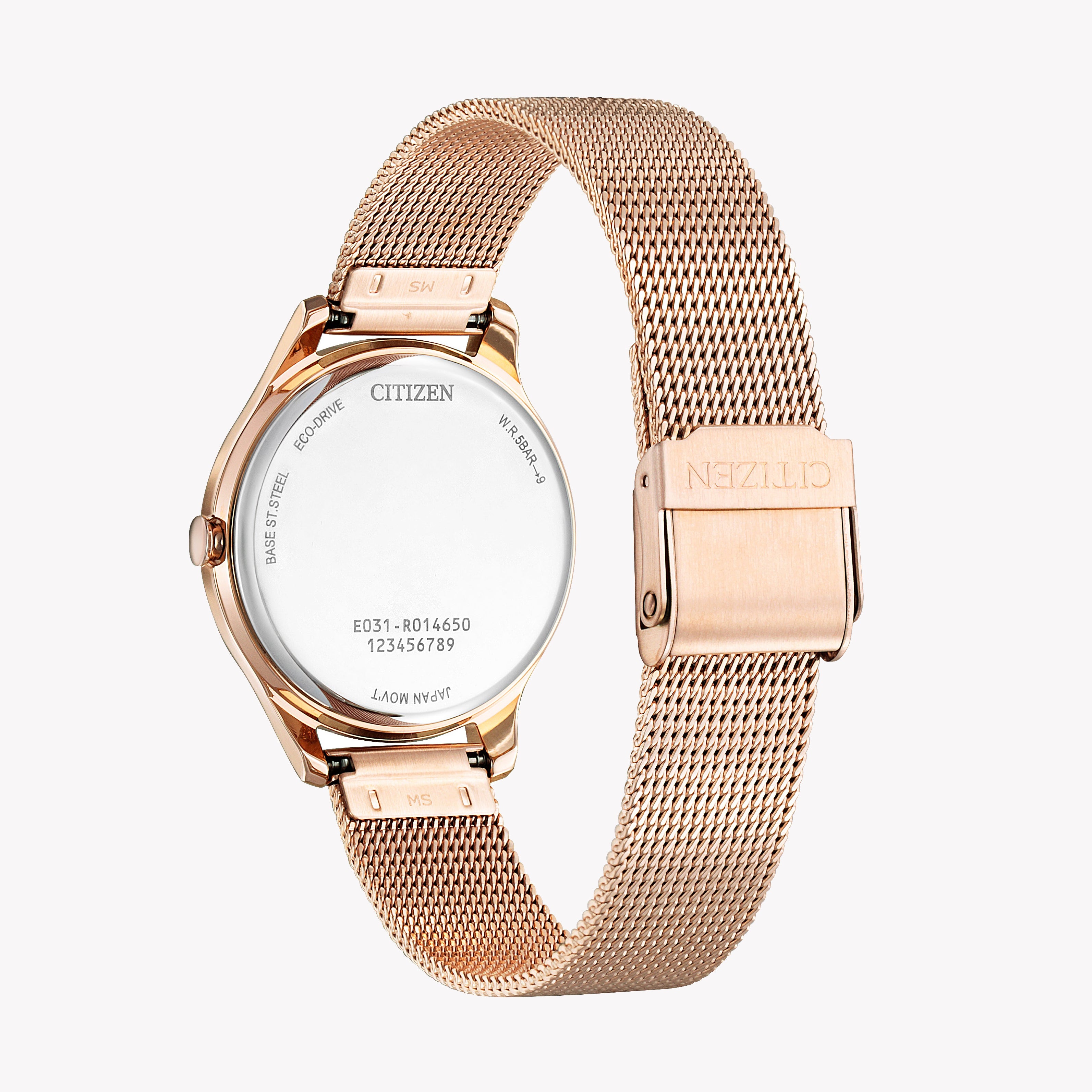 CITIZEN EM0508-80A ROSE GOLD GLAM – ELEGANTE ECO-DRIVE-DAMENUHR mit weißem Zifferblatt und Mesh-Band