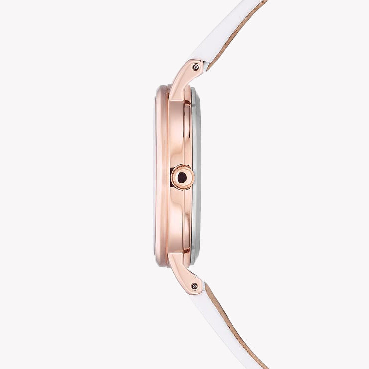 CITIZEN EM0579-14A ROSÉGOLD ELEGANCE – SCHICKE DAMENUHR mit weißem Lederband und Eco-Drive-Technologie