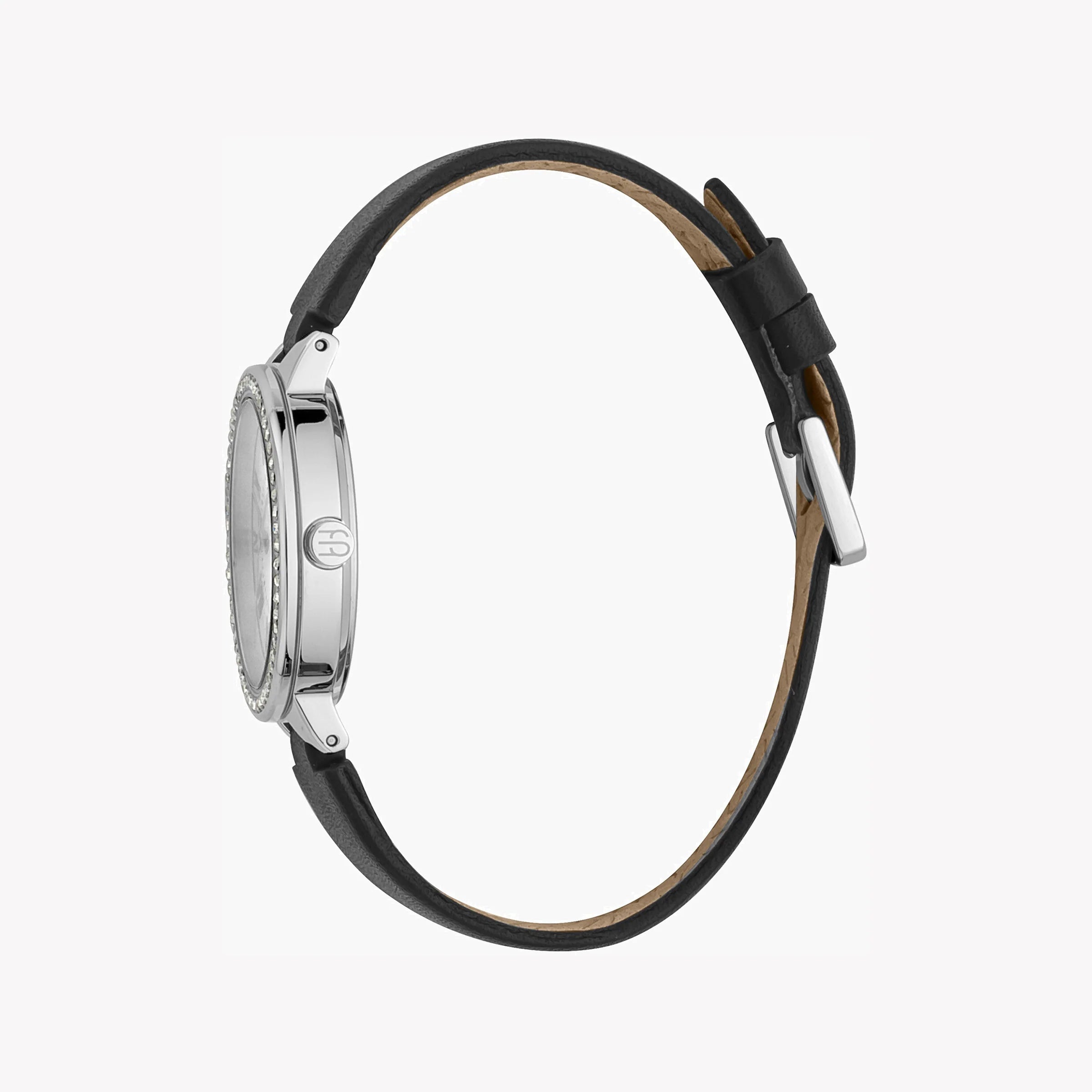 ESPRIT Damenuhr mit silbernem Edelstahlgehäuse und schwarzem Lederarmband