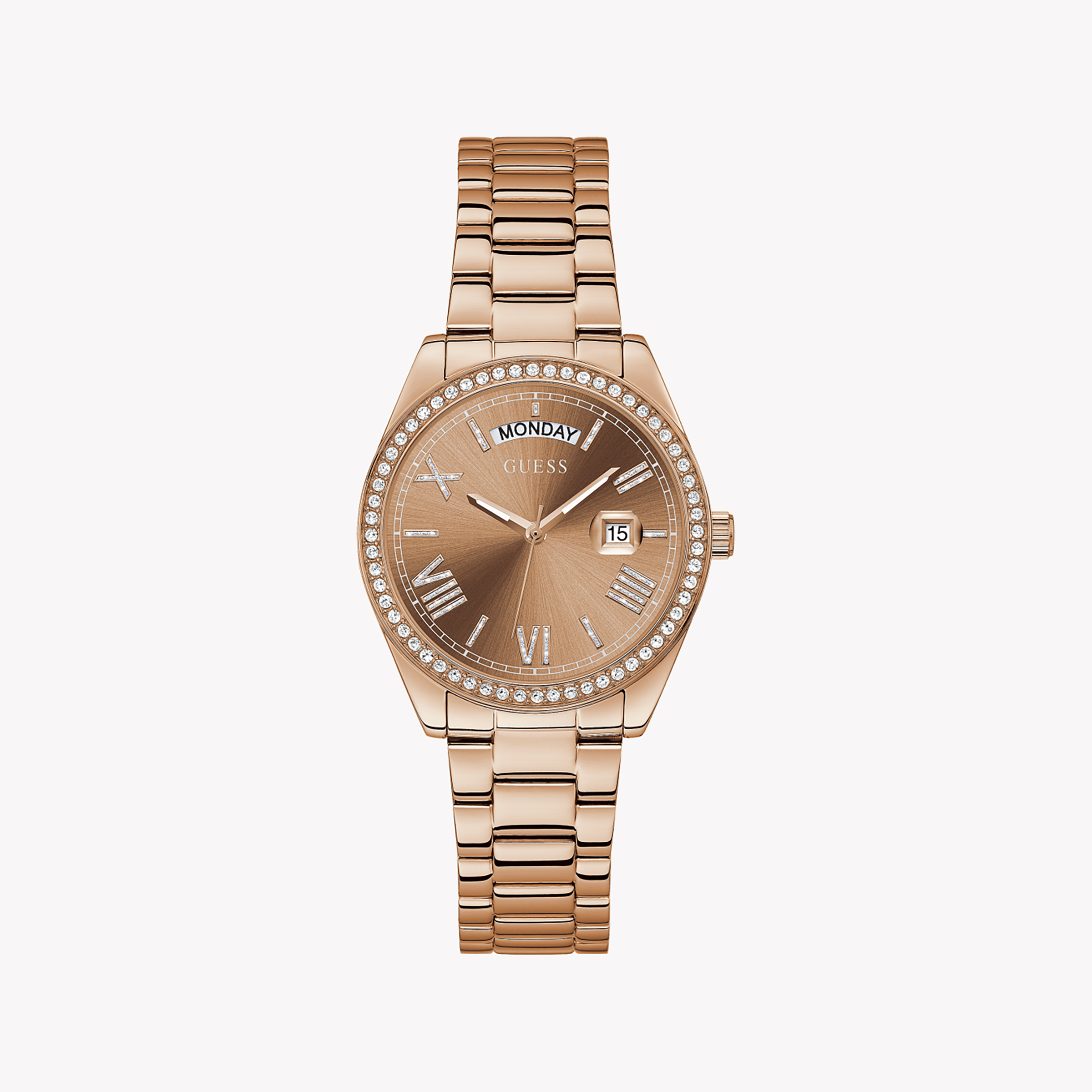 GUESS GW0307L3 – BOLD BROWN BEAUTY – Stilvolle Damenuhr mit Edelstahlarmband und auffälligem Zifferblatt