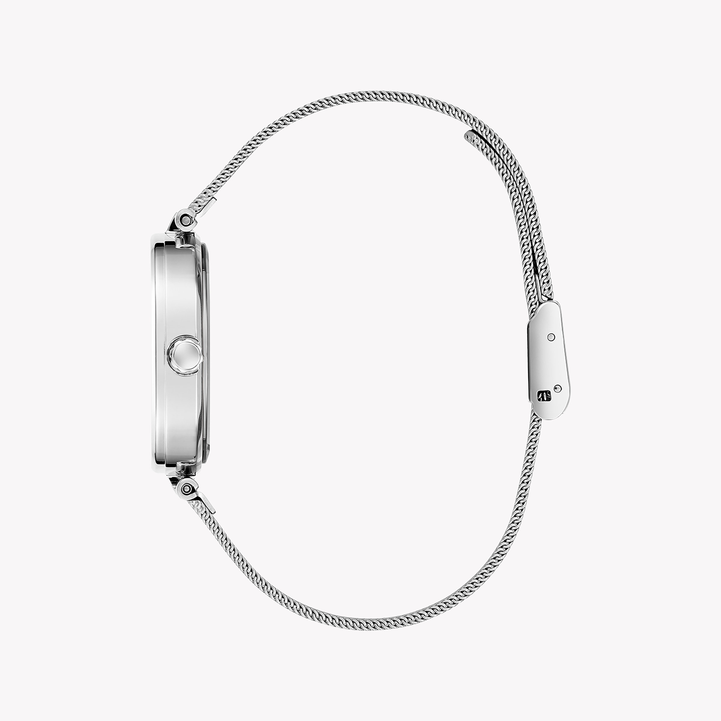- Bequemer Sitz: Entworfen mit einem eleganten Mesh-Armband in passendem Silber, bietet diese Uhr einen komfortablen und dennoch anspruchsvollen Sitz für den ganztägigen Gebrauch.