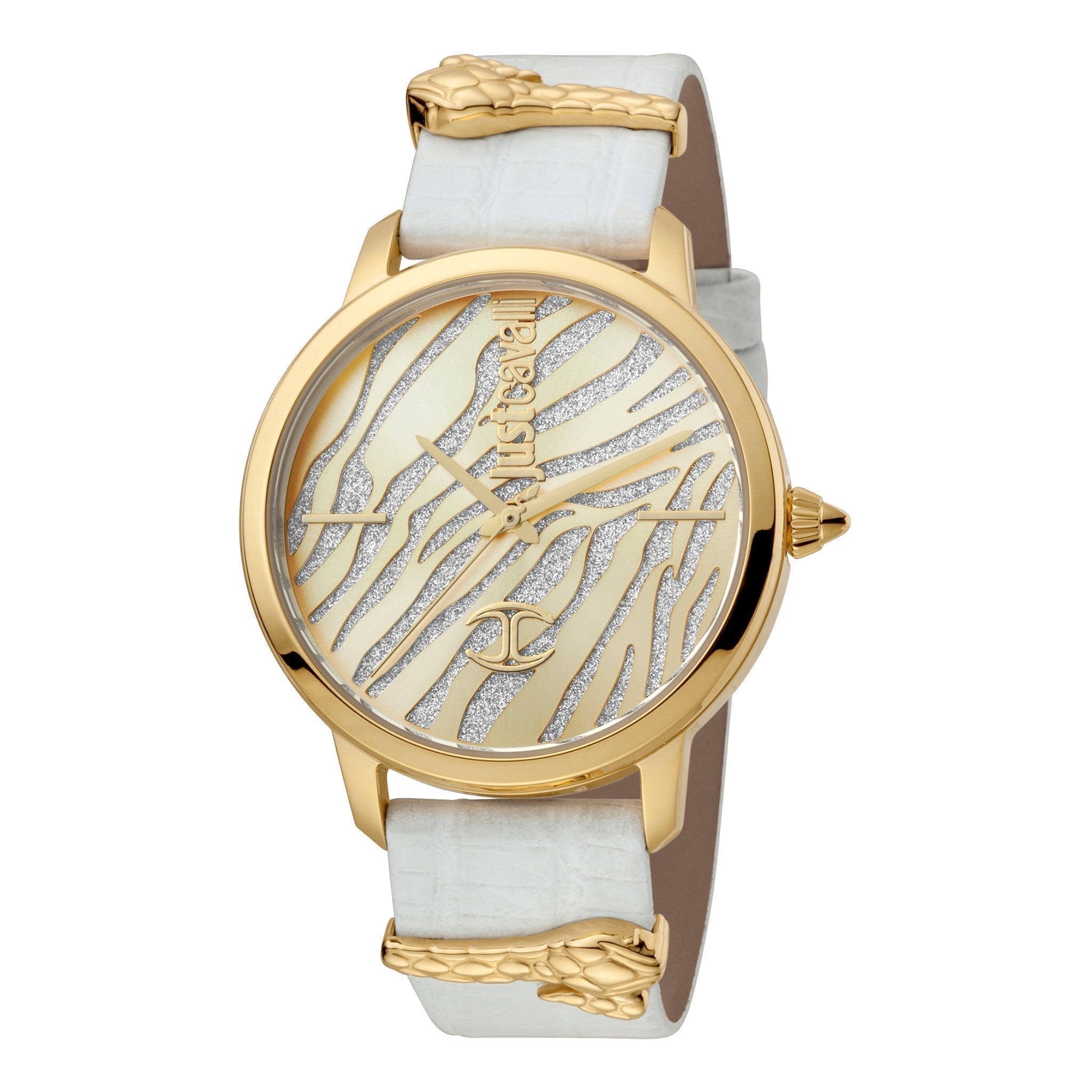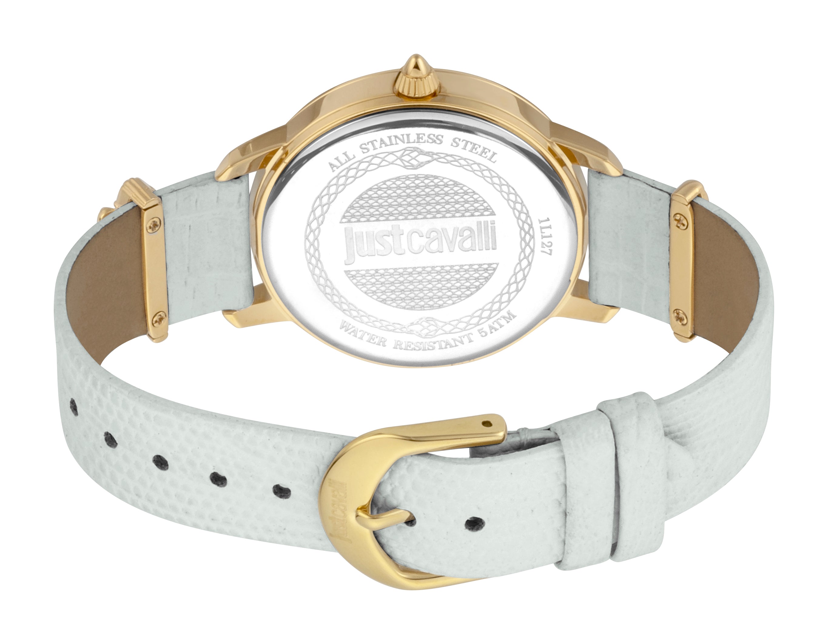 JUST CAVALLI Damenuhr mit goldenem Edelstahlgehäuse und weißem Lederarmband