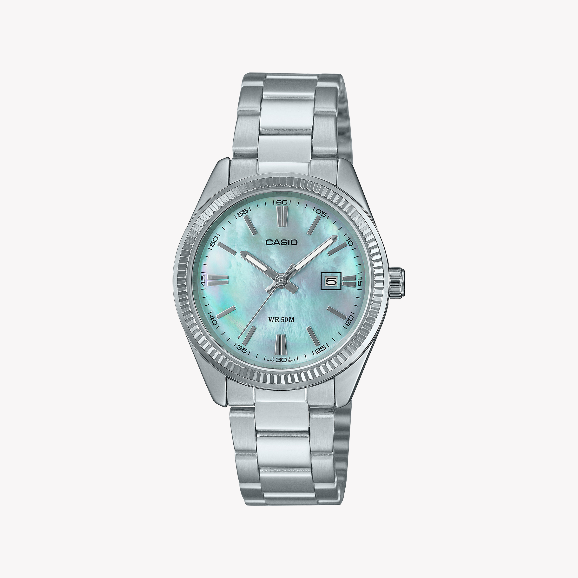 Introducing the CASIO COLLECTION & VINTAGE LTP-1302DS-2AVDF watch—an elegant timepiece designed for the modern woman. The striking blue dial beautifully contrasts the polished silver stainless steel band and case. With a 30.2 mm size and 5 ATM water resistance, this watch combines sophistication and practicality for any occasion. Embrace timeless style and reliability with this must-have accessory!