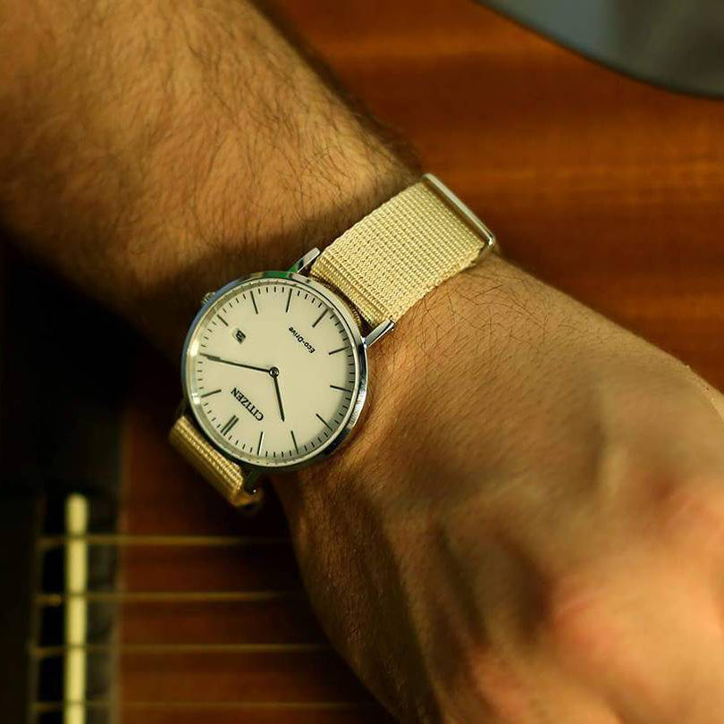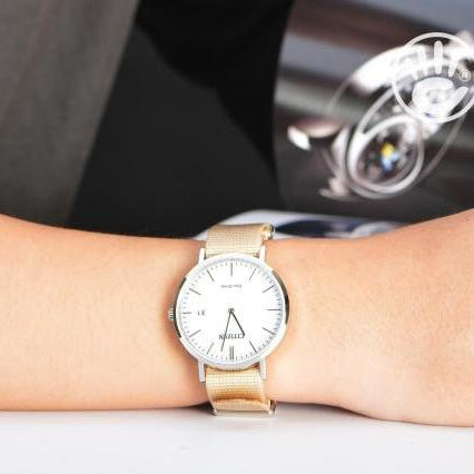 - Bequeme Passform: Das beigen Nylonband sorgt nicht nur für einen Hauch von Raffinesse, sondern garantiert auch leichtgewichtigen Komfort für den täglichen Gebrauch.
