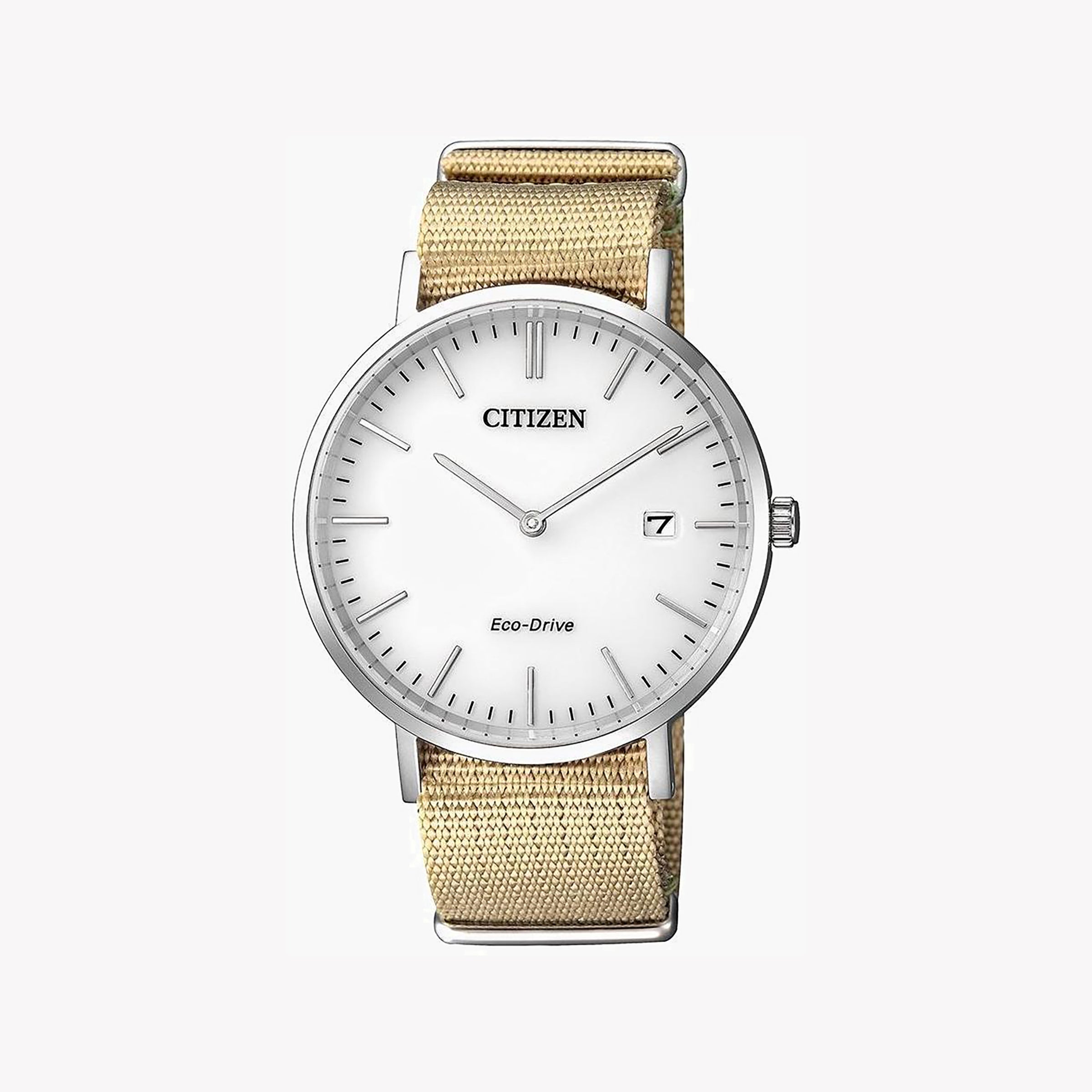 CITIZEN AU1080-20A DYNAMIC STYLE – ECO-DRIVE HERRENUHR mit silbernem Gehäuse und beigem Nylonarmband