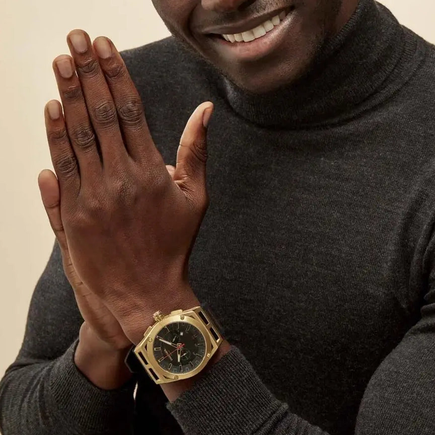 - Auffällige Ästhetik: Mit ihrem 48 mm Gehäuse aus Edelstahl in auffälligem Gold und einem eleganten schwarzen Zifferblatt ist diese Uhr das perfekte Accessoire, um ein selbstbewusstes Statement zu setzen.