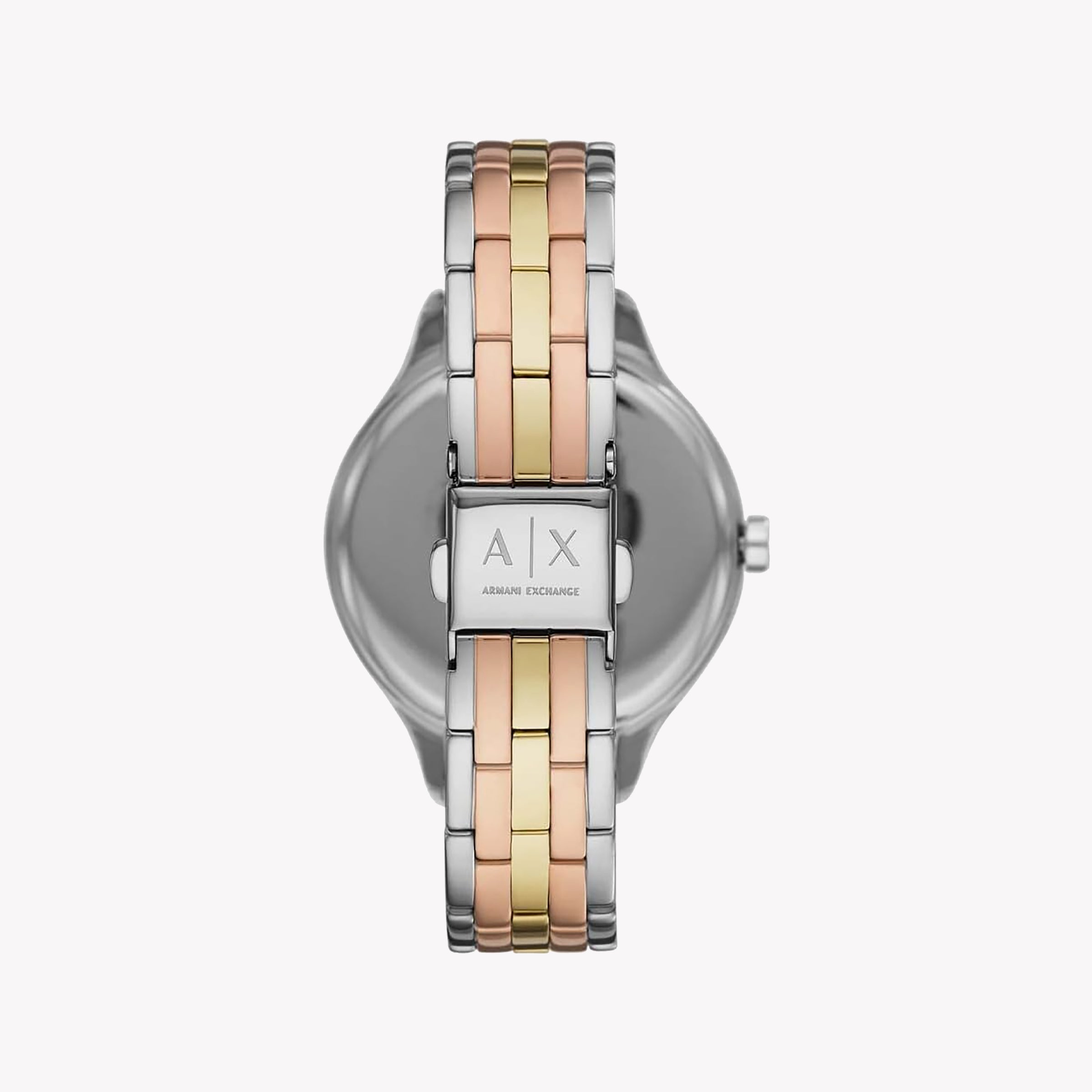 Kaufen Sie die Damenuhr A|X ARMANI EXCHANGE AX5615 mit 36-mm-Edelstahlgehäuse, präzisem Quarzwerk und schickem Silber-/Goldarmband. Wasserdicht bis 5 ATM.