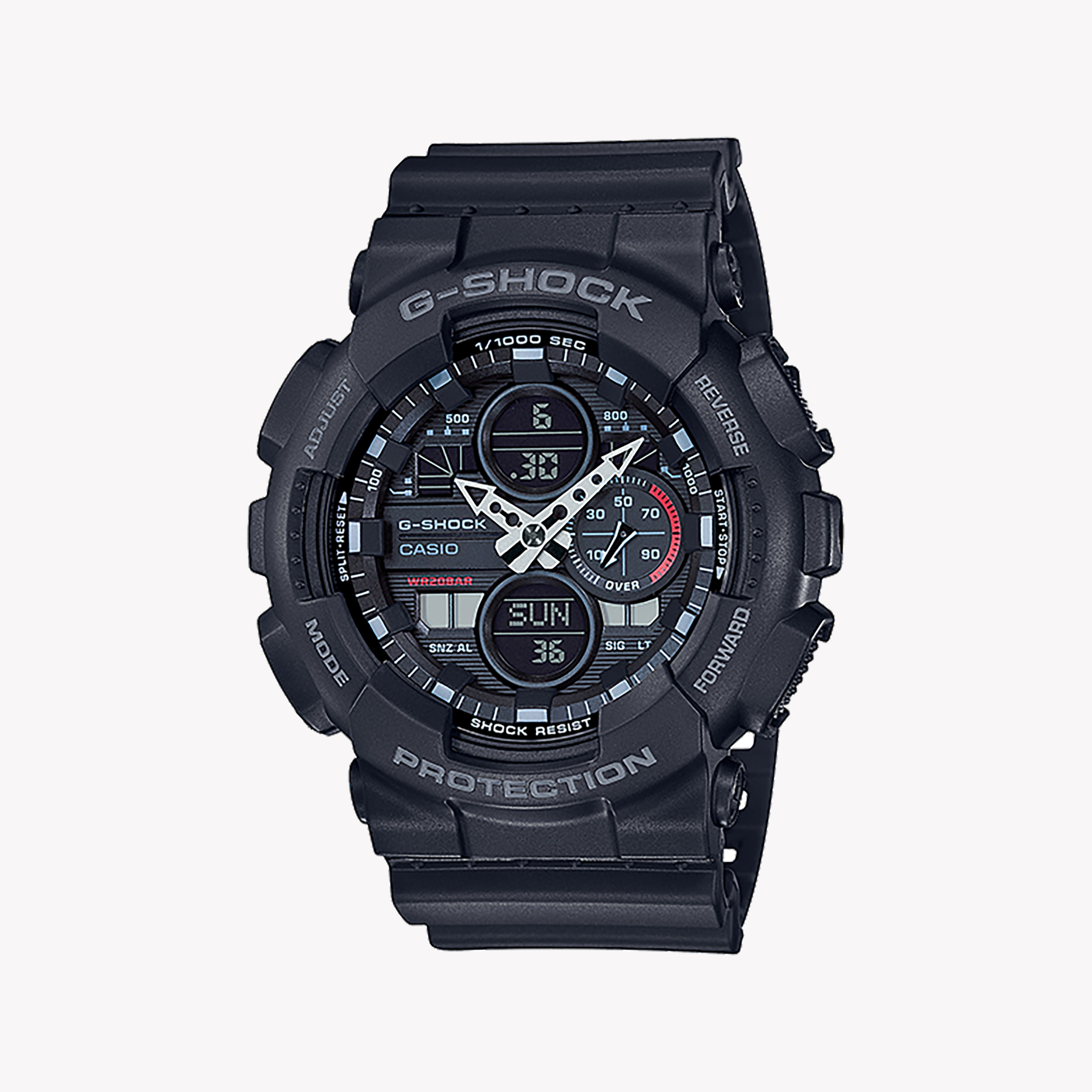 Entdecken Sie die G-SHOCK Herrenuhr GA-140-1A1DR, die ein kühnes Design mit langlebigen Funktionen wie 200 m Wasserdichtigkeit, 1/1000 s Stoppuhr und Stoßfestigkeit kombiniert.