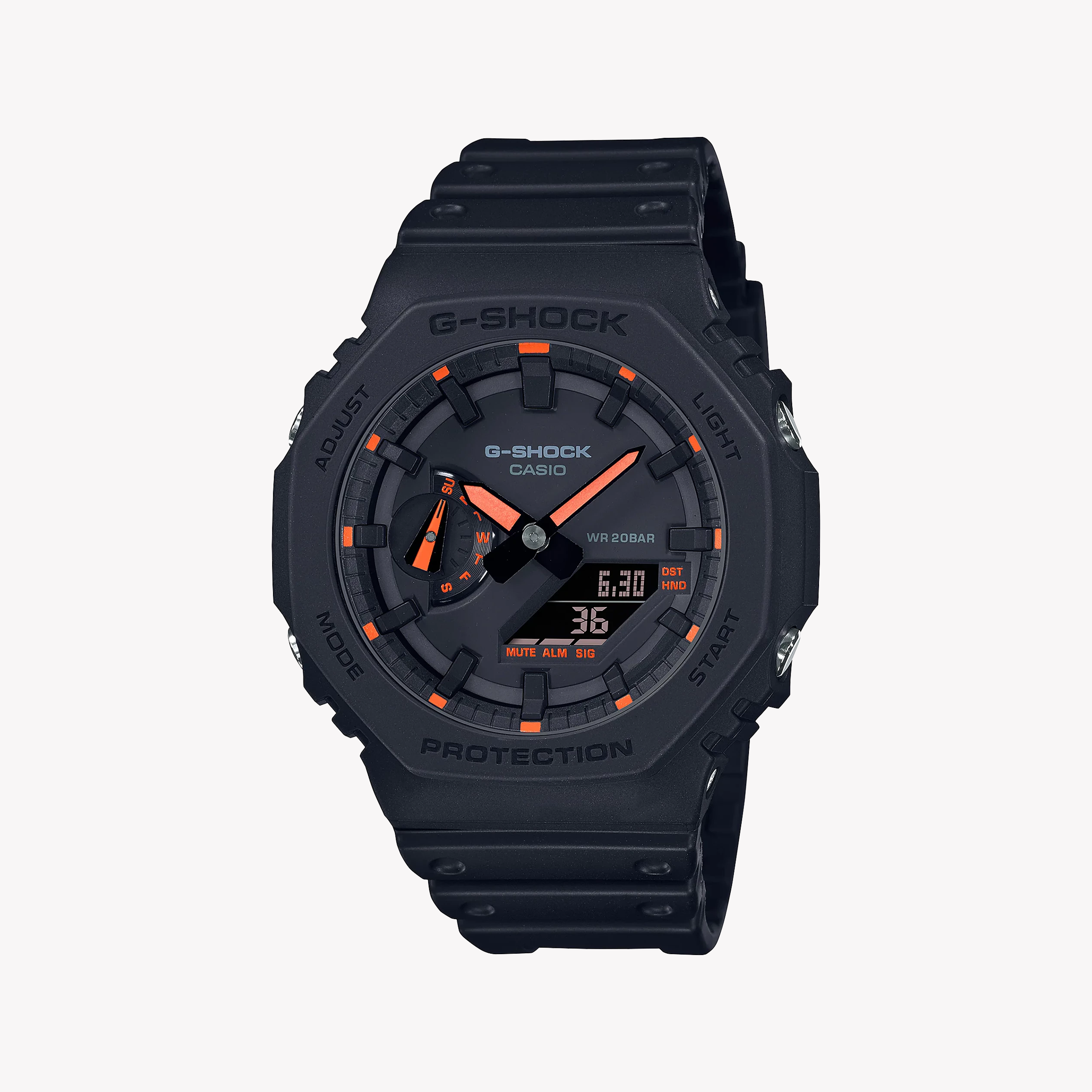 - Auffällige Ästhetik: Die GA-2100-1A4DR zeigt ein schlankes, achteckiges Gehäuse und eine matte schwarze Oberfläche, die durch lebendige digitale Anzeigen akzentuiert wird und ein gewagtes Accessoire ist, das Aufmerksamkeit erregt.