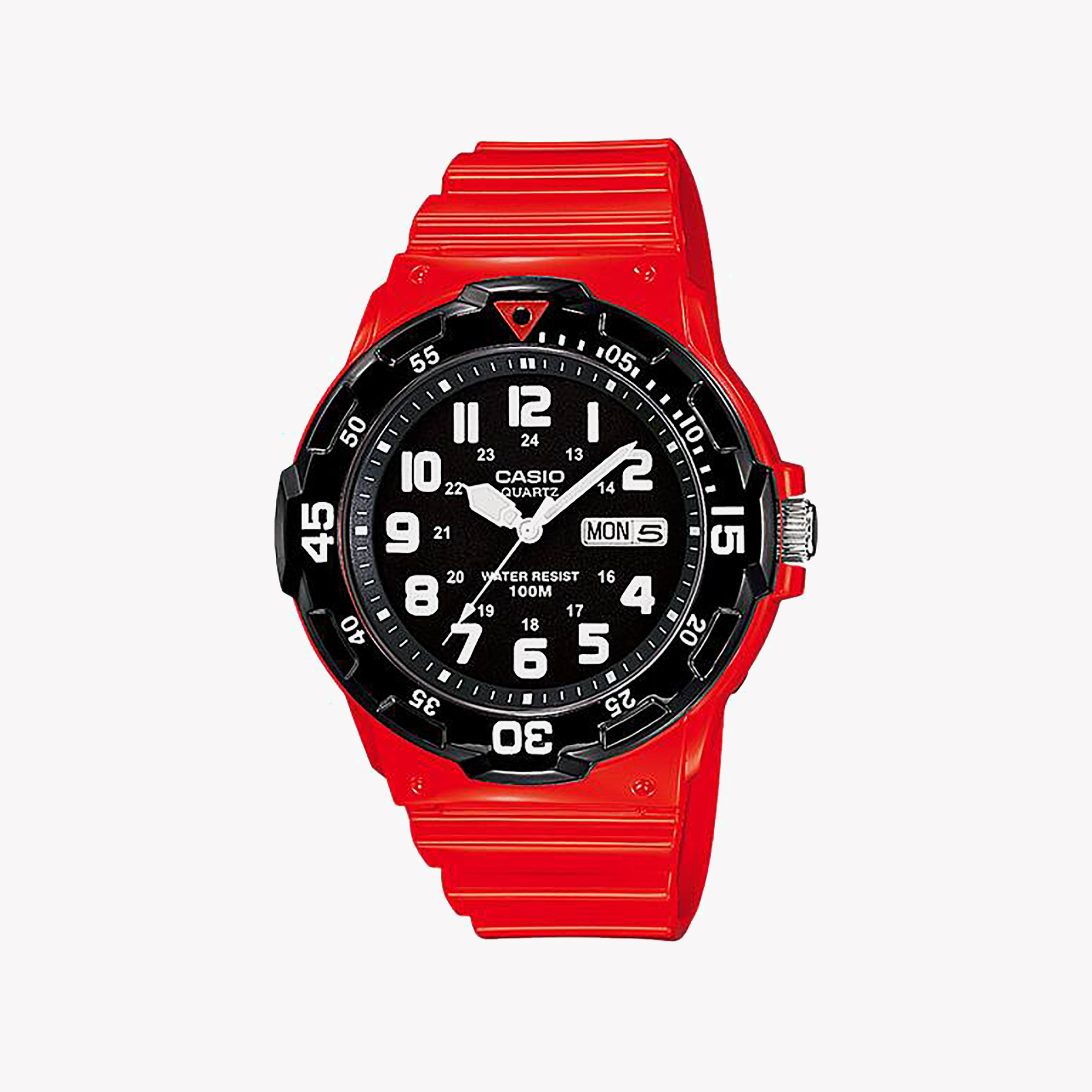 CASIO MRW-200HC-4BVDF ADVENTURE READY – mutige rote Sport-Herrenuhr mit schwarzem Zifferblatt und drehbarer Lünette