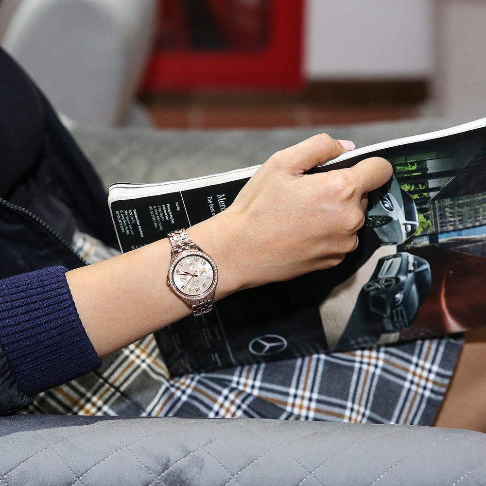 - Funkelnde Akzente: Verziert mit funkelnden Swarovski®-Kristallen auf der Lünette und den Stundenmarkierungen, verleiht diese Uhr jedem Ensemble einen Hauch von Glamour.
