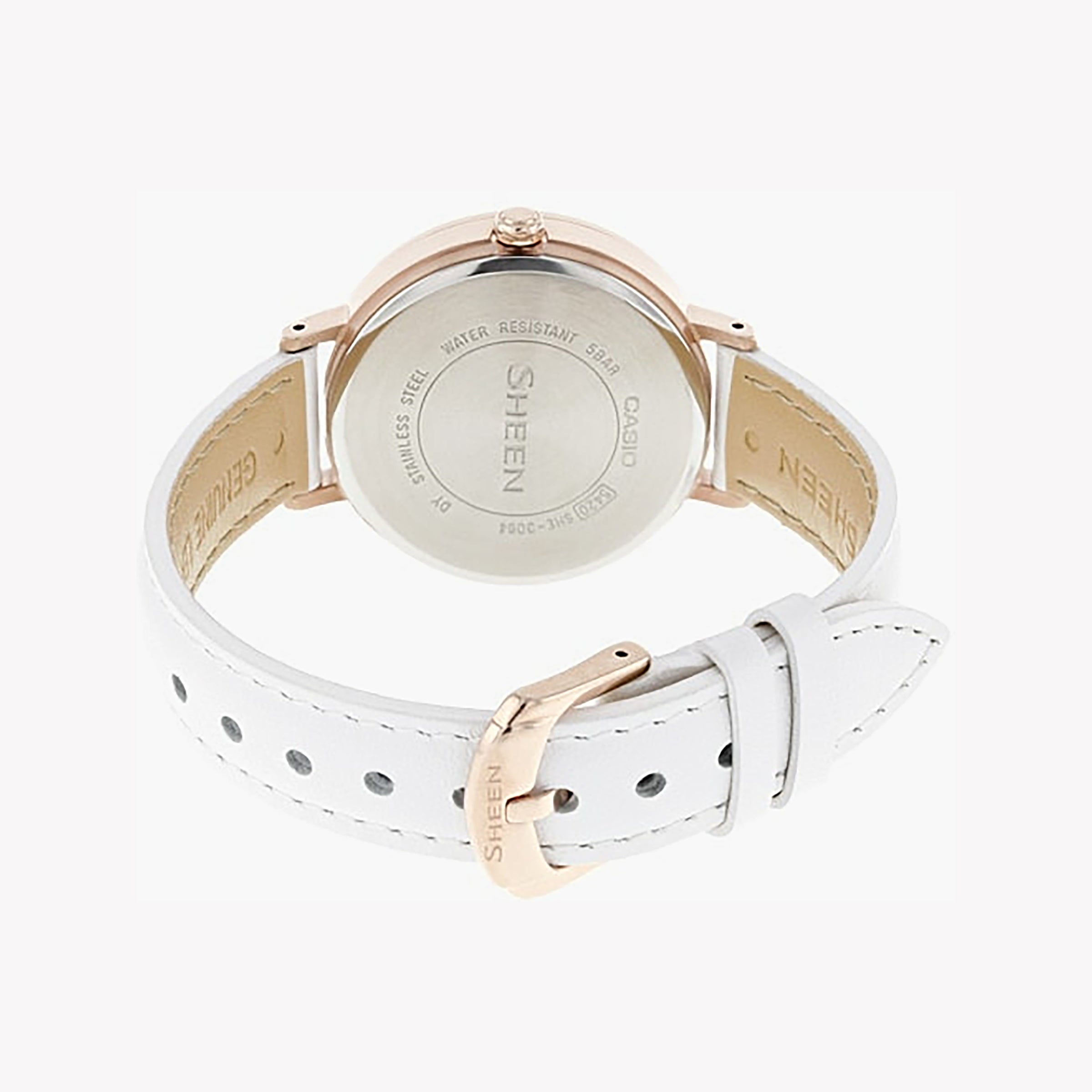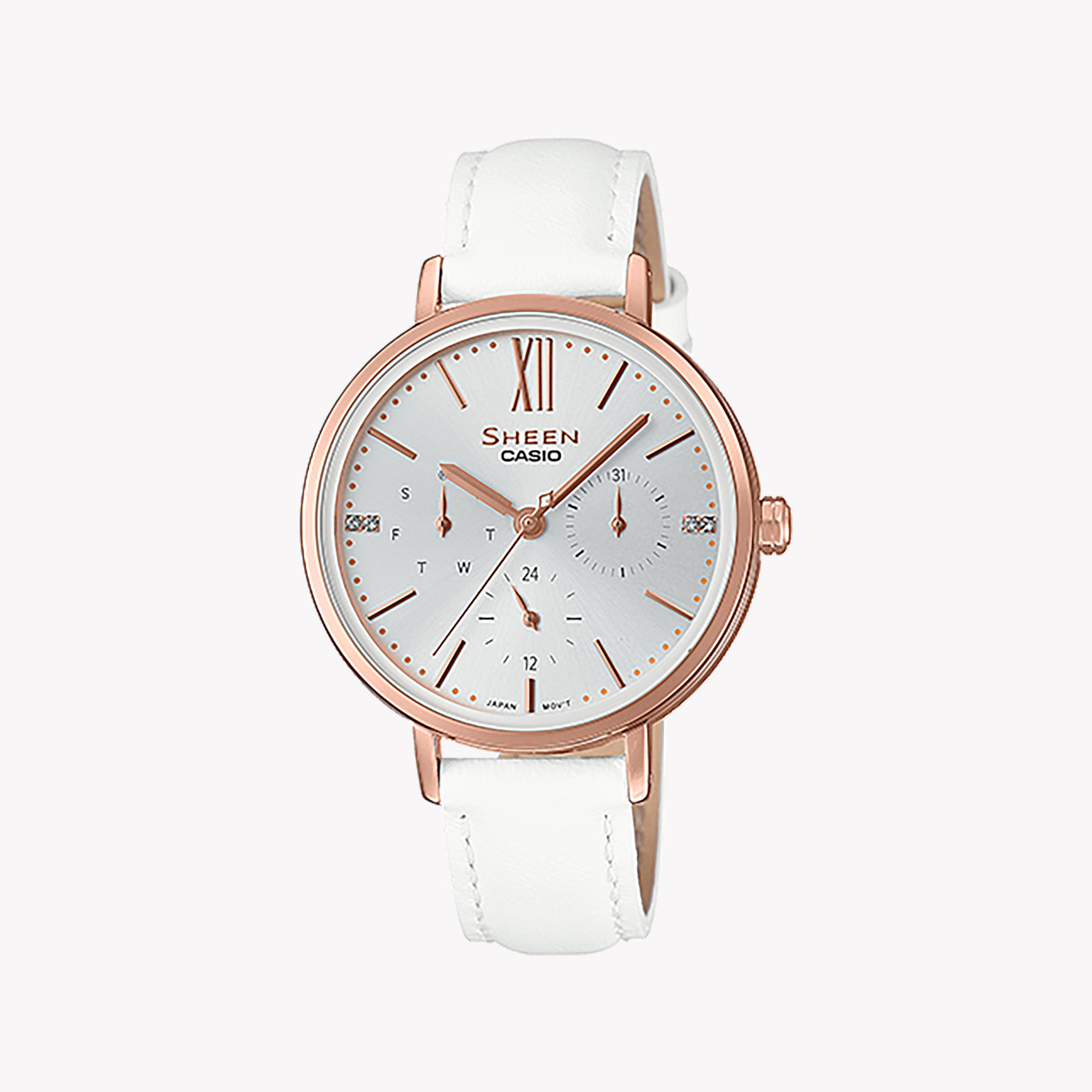 CASIO SHE-3064PGL-7AUDF – SPORTLICHE ELEGANZ MIT ROSÉGOLD-GLAMOUR Damenuhr mit Lederband und funkelndem Swarovski®-Detail