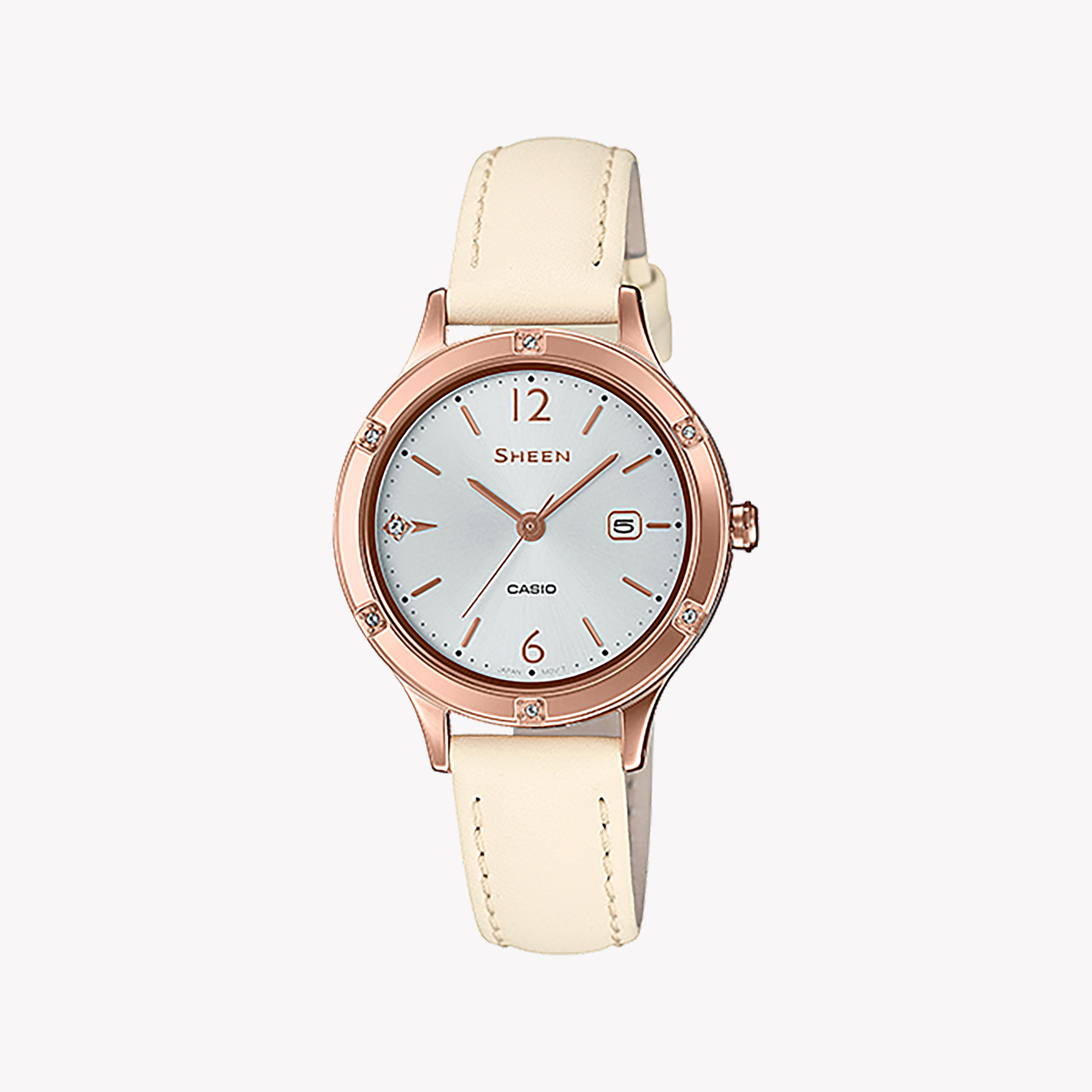 CASIO SHE-4533PGL-7AUDF ELEGANCE – ROSÉGOLD SCHÖNHEIT MIT SPORTLICHEM CHARME Damenuhr – Schickes weißes Zifferblatt und Lederarmband