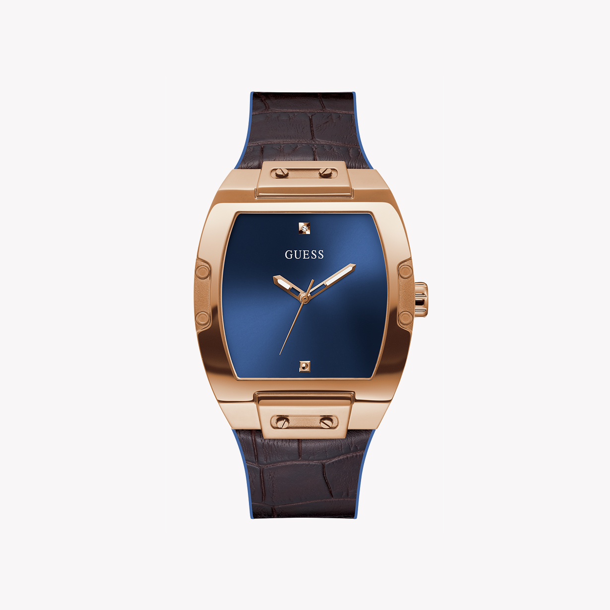 GUESS GW0386G2 – ELEGANTE HERRENUHR AUS ROSÉGOLD MIT BRAUNEM LEDERBAND UND BLAUEM ZIFFERBLATT