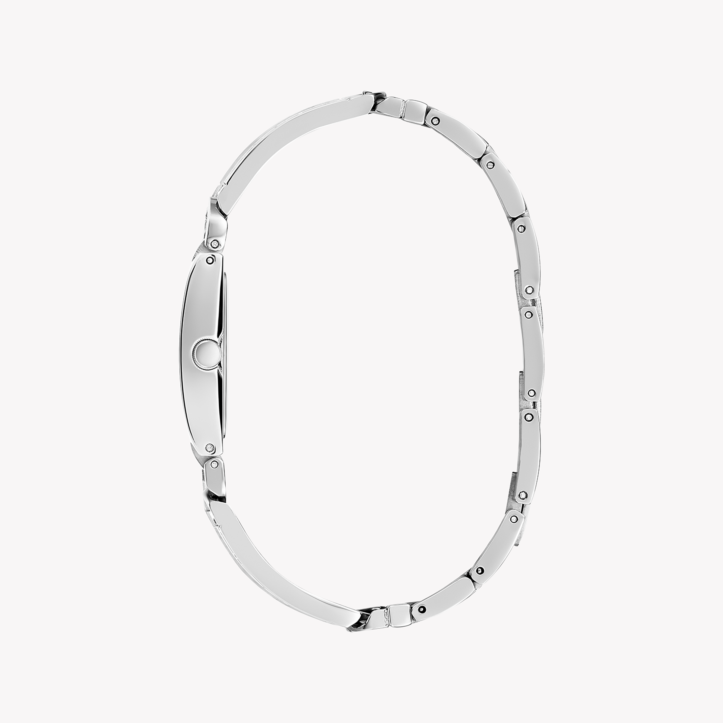 - Elegante Ästhetik: Das 24 mm Gehäuse aus Edelstahl glänzt in einem strahlenden Silberton und bietet einen polierten Look, der nahtlos von Tag zu Nacht übergeht.