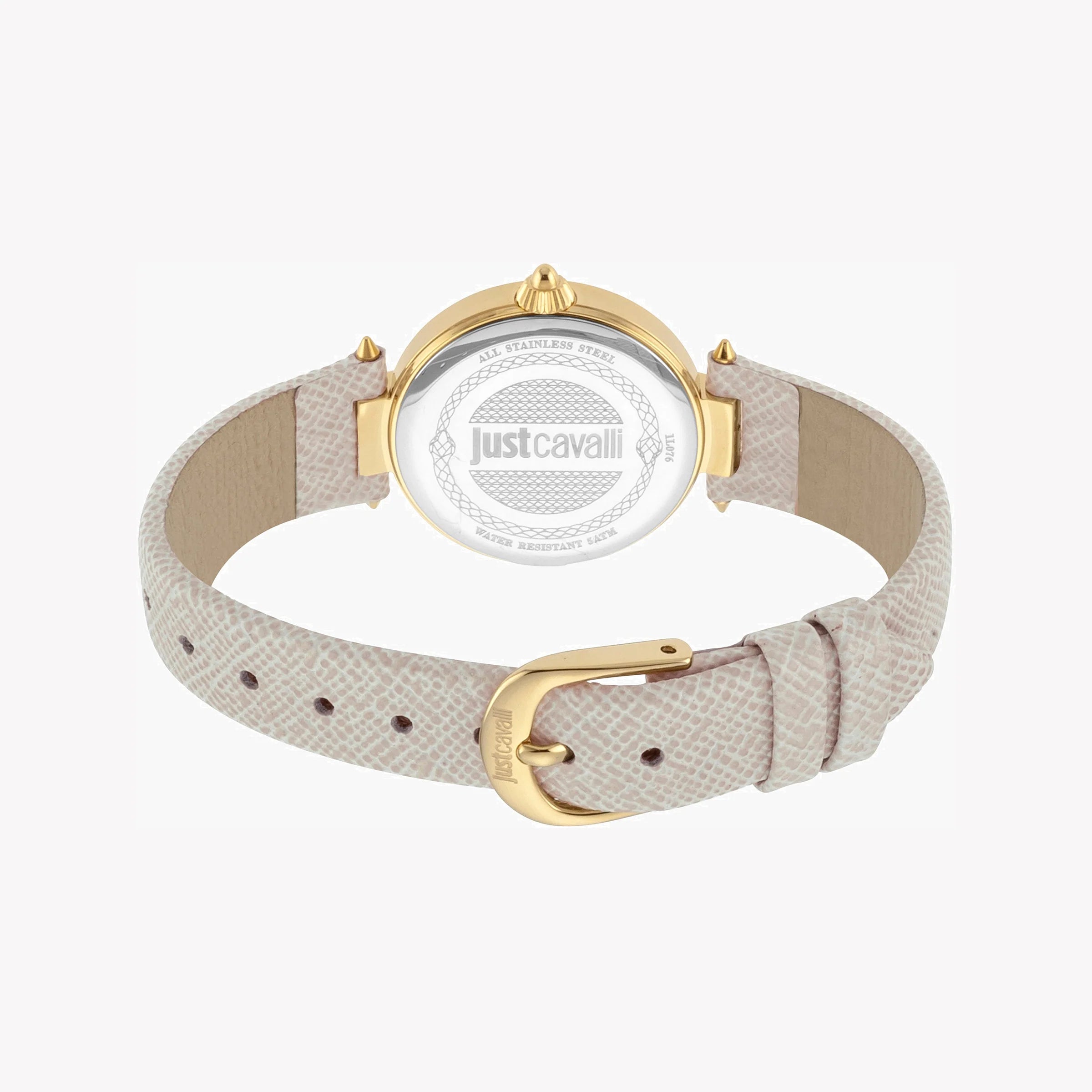 JUST CAVALLI Damenuhr mit goldenem Edelstahlgehäuse und grauem Lederarmband