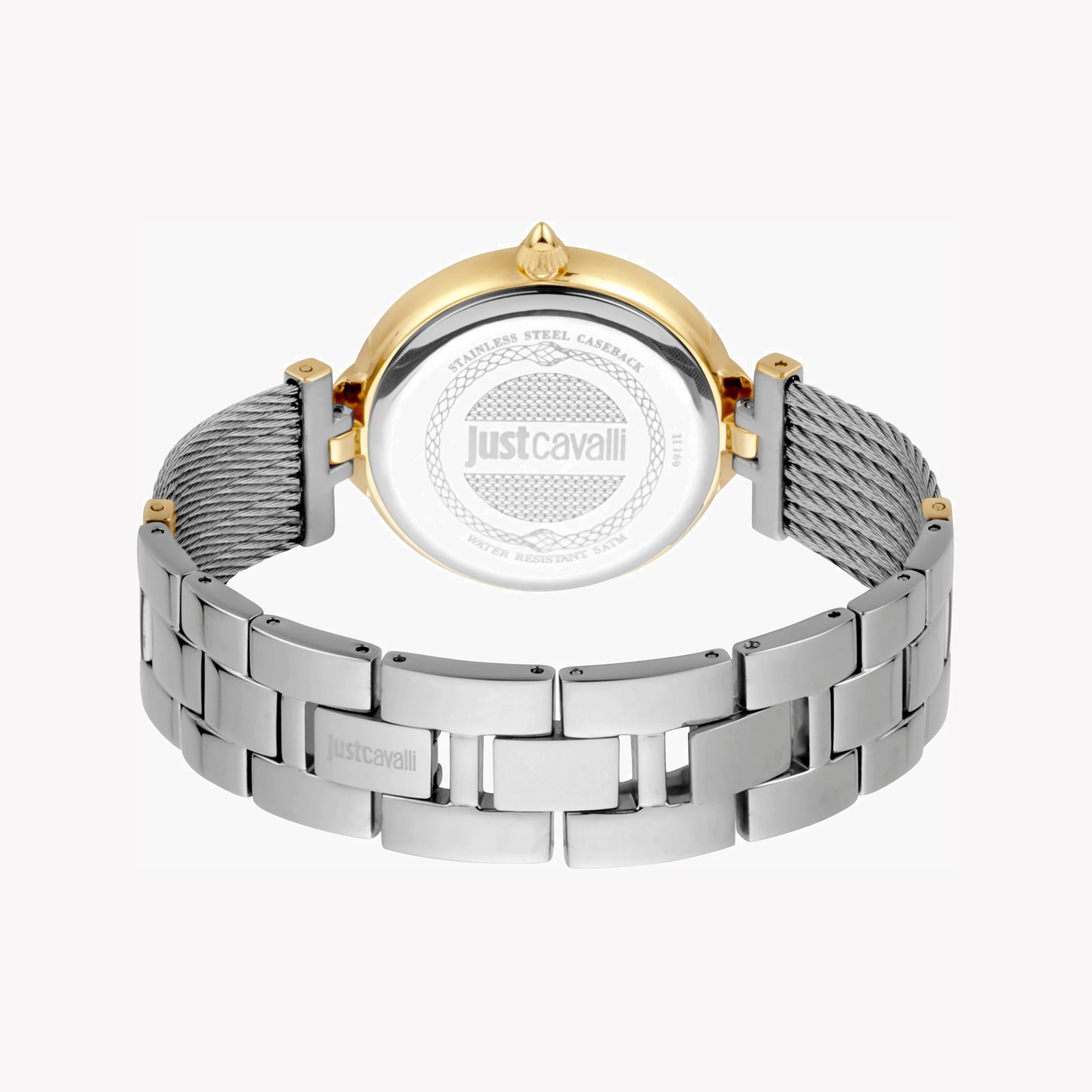 JUST CAVALLI Damenuhr mit goldenem Edelstahlgehäuse und silber-goldenem Edelstahlarmband