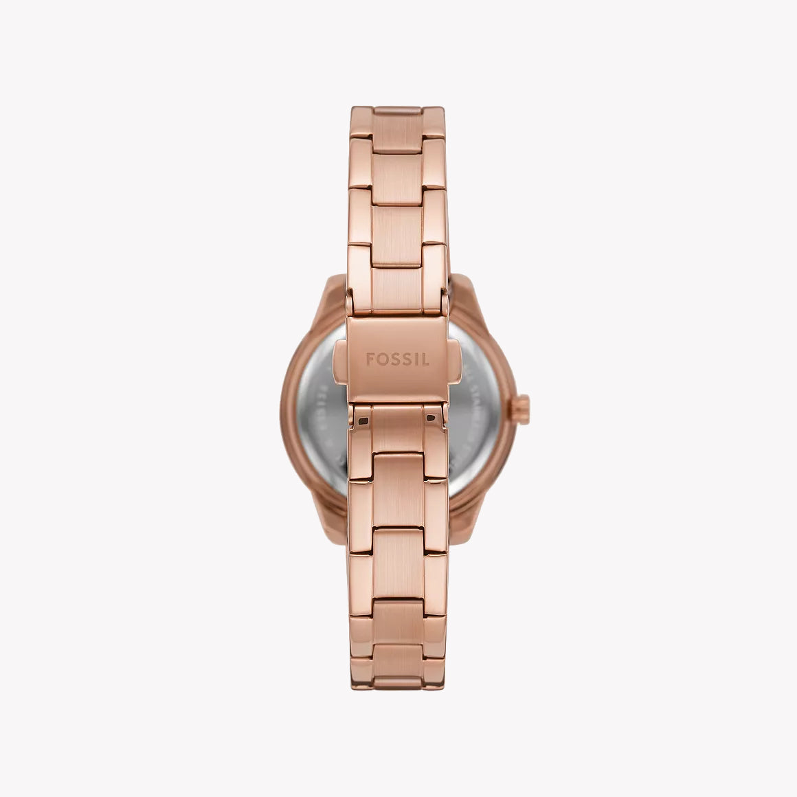 Introducing the FOSSIL Rose Gold Women's Watch - an elegant timepiece for those seeking sophistication. With a 30mm gold stainless steel case and band, silver dial, and 5 ATM water resistance, it's both stylish and durable. Perfect for any occasion.