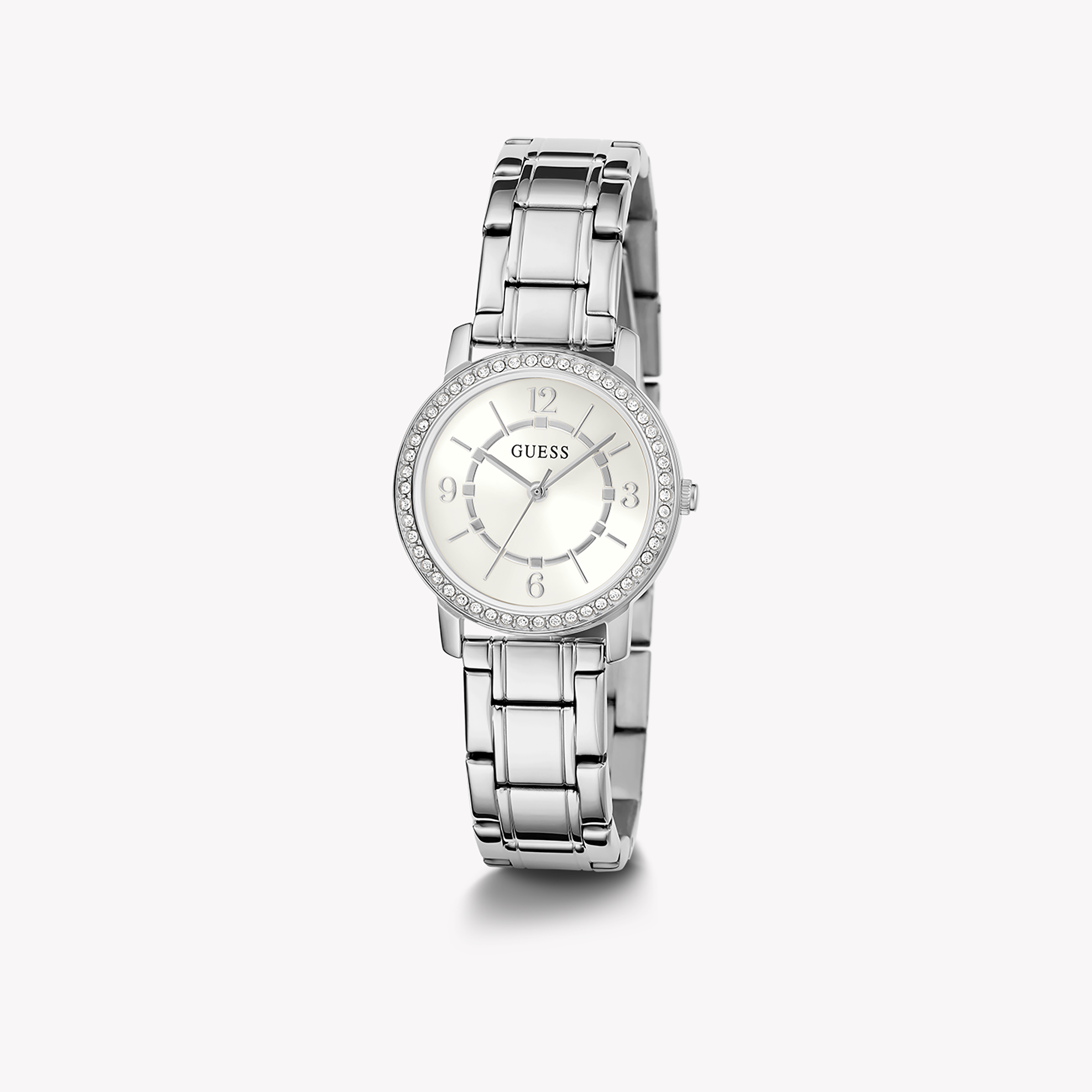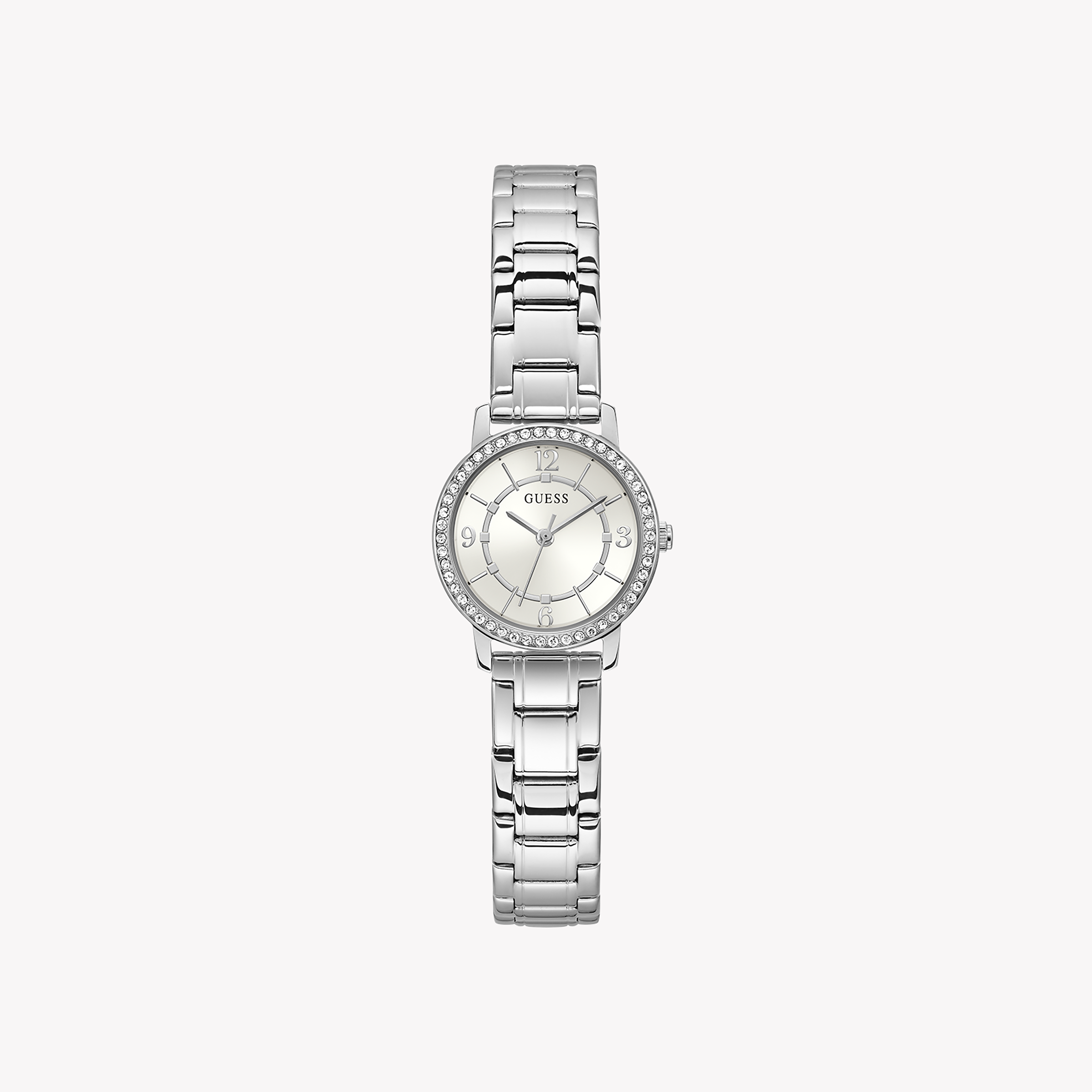 Elevate your style with the GUESS GW0468L1, an elegant women's watch featuring a stunning silver dial, chic 28 mm stainless steel case, and a luxurious silver band. With 3 ATM water resistance, this timepiece is perfect for any occasion.