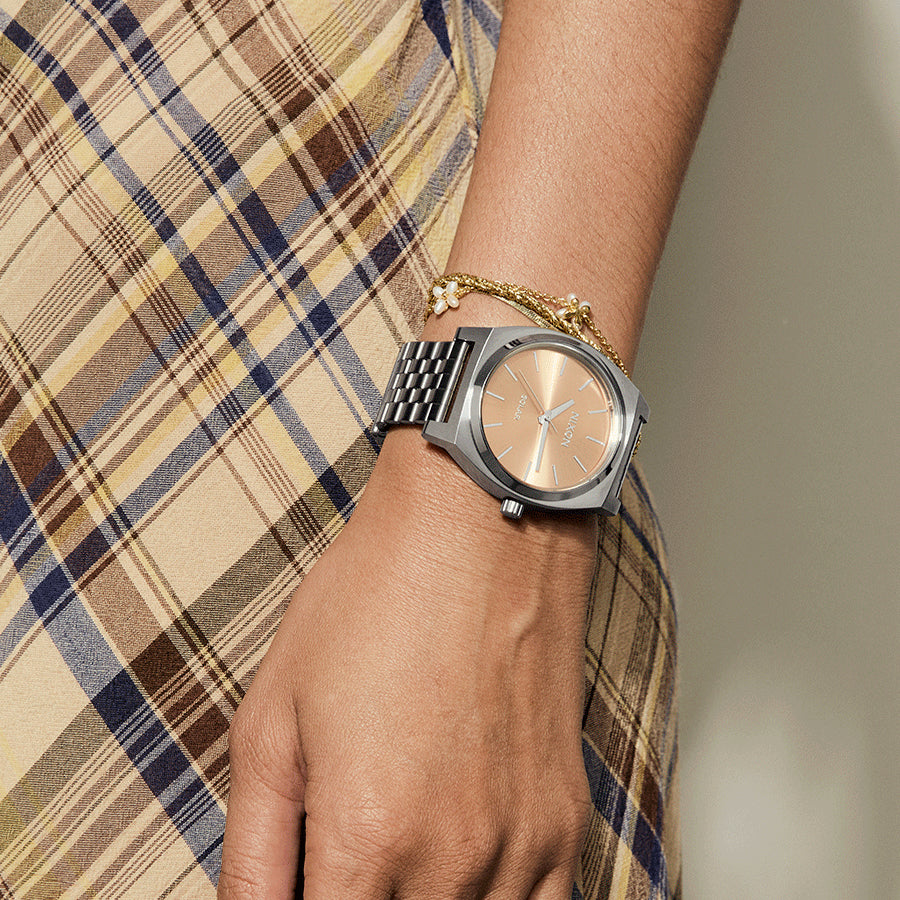 Experience the allure of the NIXON A1369-5332 unisex watch—a symbol of elegance and precision. With a sleek silver stainless steel band, stunning rose gold dial, and 40mm case, this timepiece is perfect for women seeking sophistication. Dive into style with 10 ATM water resistance.
