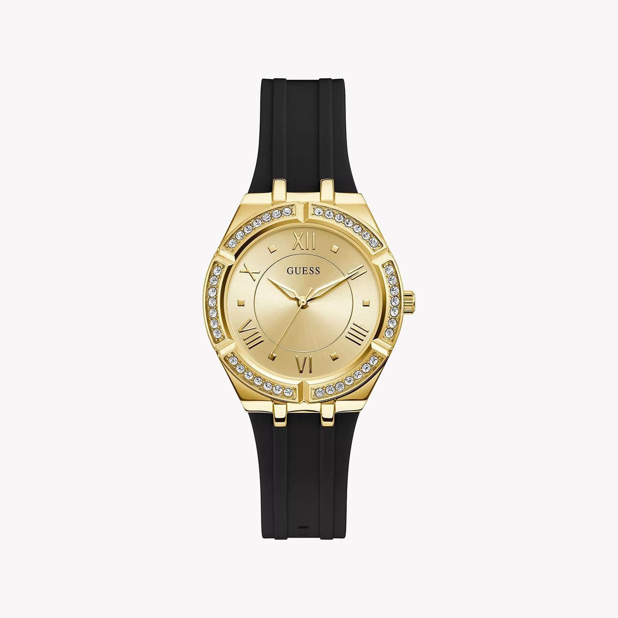 Embrace elegance with the GUESS Gold & Black Women's Quartz Watch. This sophisticated timepiece features a striking gold stainless steel case and dial paired with a sleek black silicone band, perfectly blending style and durability. Ideal for the modern woman who appreciates chic design and reliable functionality.