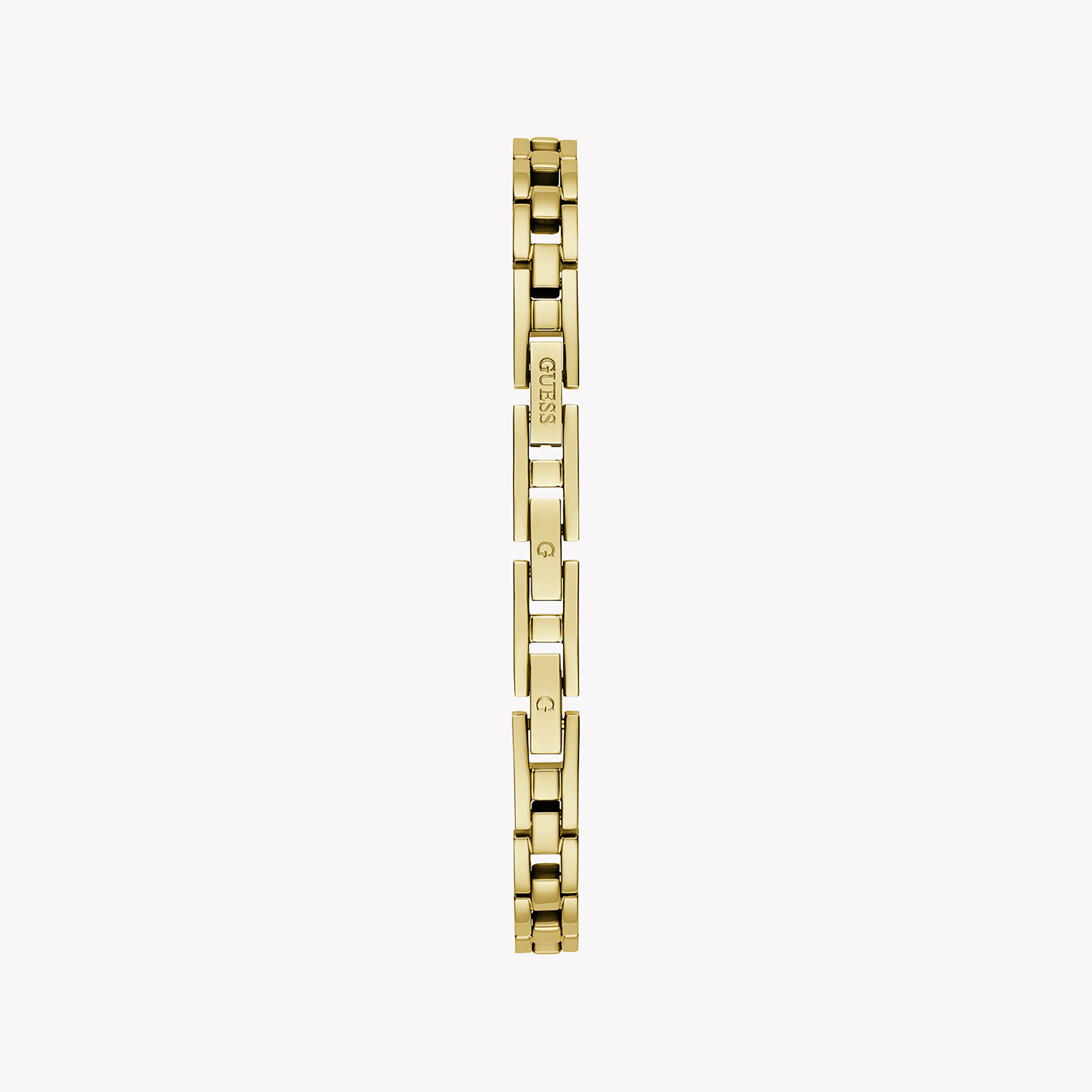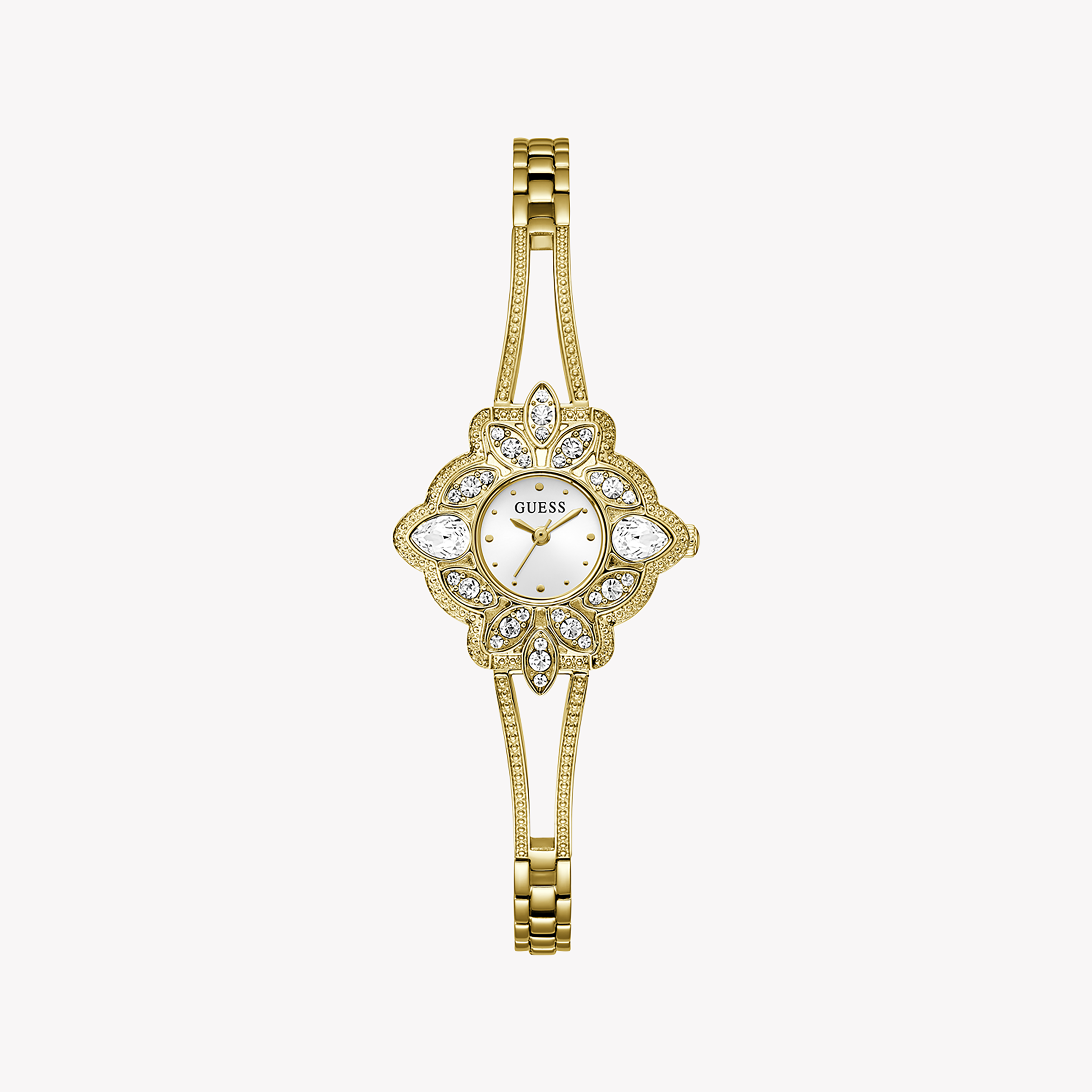 Accentuate your style with the GUESS GW0681L2, an elegant women's watch featuring a radiant gold 32 mm recycled steel case and a crisp white dial. With a comfortable gold band and 3 ATM water resistance, it’s perfect for any occasion!