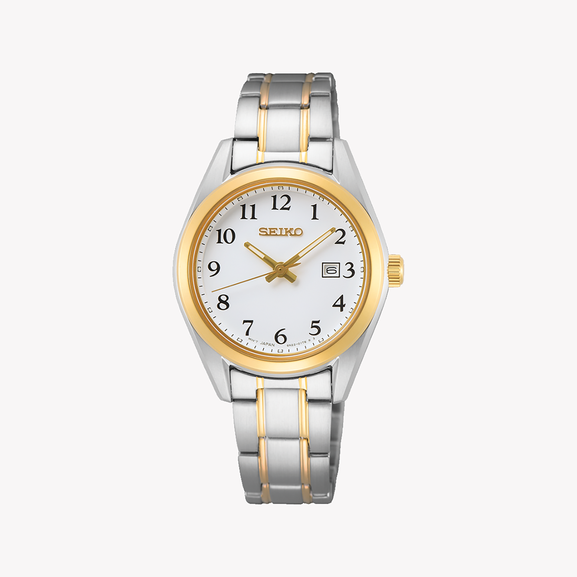 Step into sophistication with the SEIKO SUR466P1, an elegant timepiece featuring a stunning silver and gold band, a sleek 30mm stainless steel case, and a pristine white dial. Perfect for every occasion, this women's watch combines style and reliability with a 10 ATM water resistance rating. Make a statement that lasts!