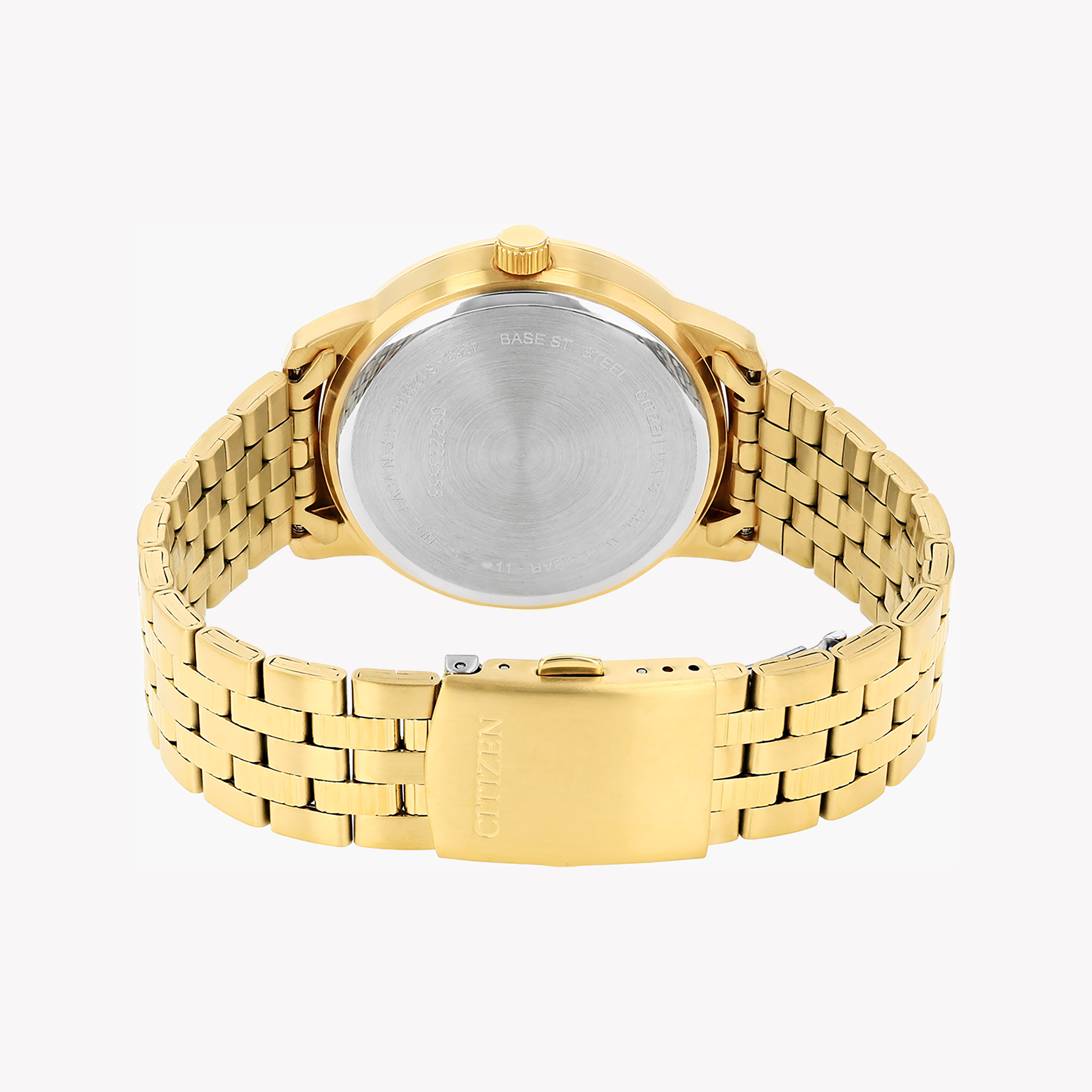 The CITIZEN DZ0052-51E is a striking timepiece designed for the modern man who appreciates a blend of functionality and style. This watch stands out with its unique black dial and lustrous gold accents, making it a perfect choice for any occasion, from business meetings to evening events.