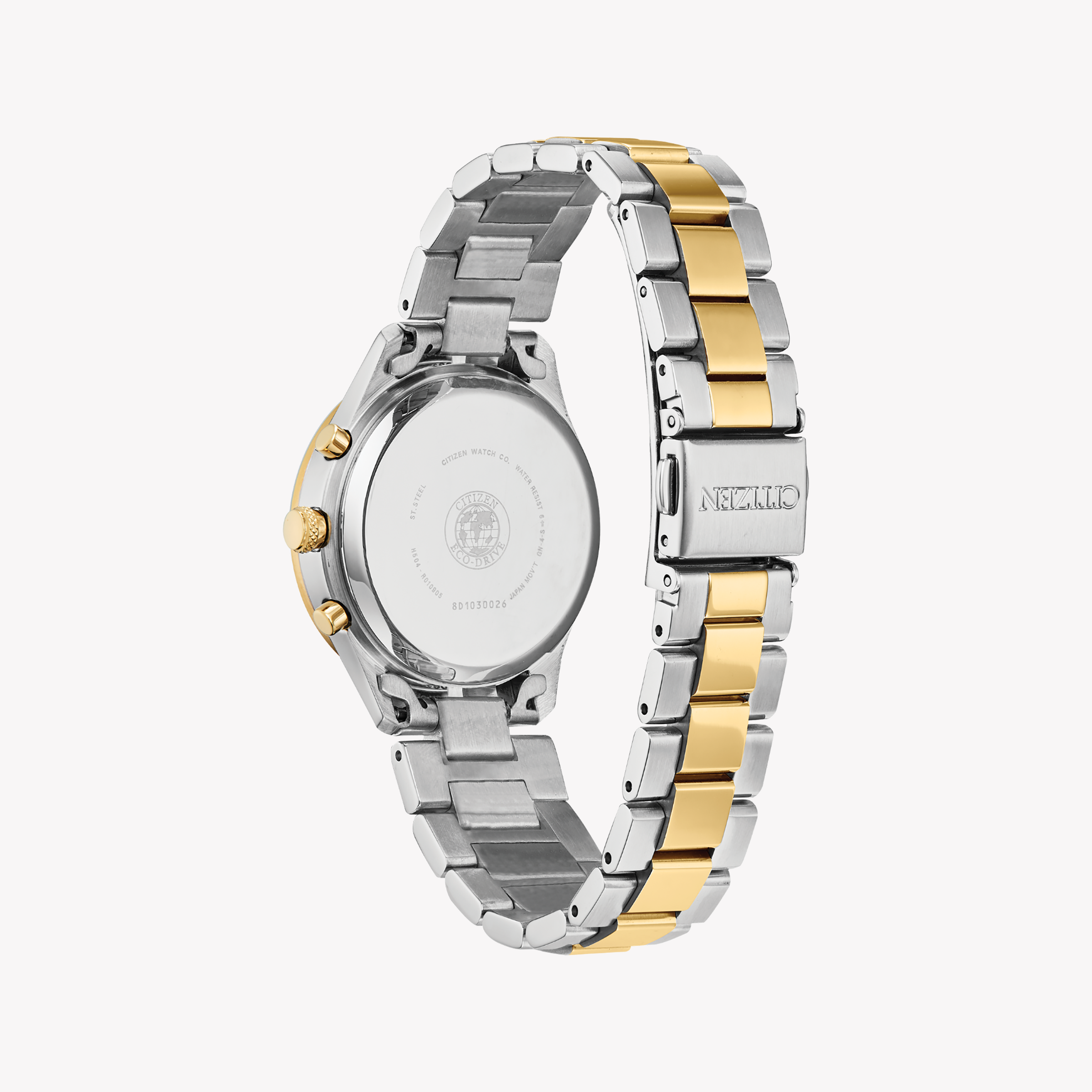 Explore dynamic versatility with the CITIZEN FB1444-56D women's watch. This 32 mm stainless steel timepiece features Eco-Drive, 5 ATM water resistance, and chic gold accents.