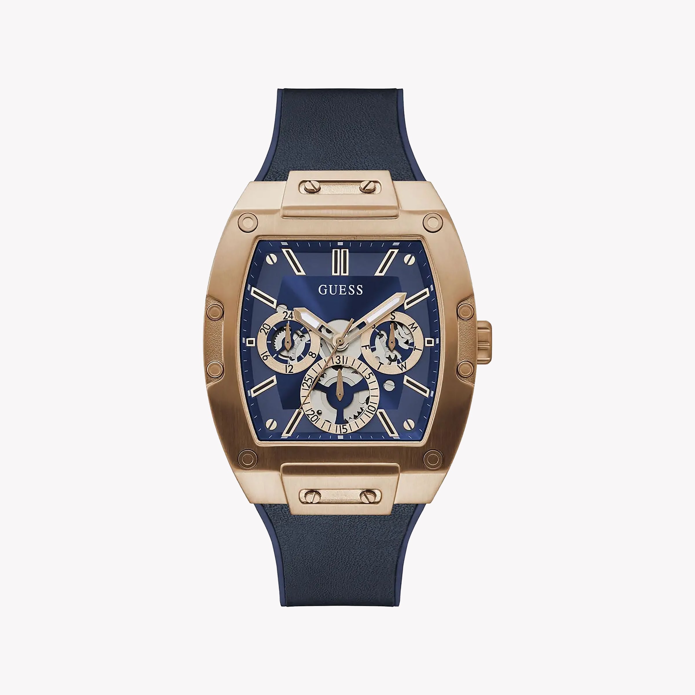 Experience elegance with the GUESS Men's Rose Gold & Dark Blue Quartz Watch. This sophisticated timepiece features a 41.5mm rose gold stainless steel case, a multicolor dial, and a resilient dark blue silicone band. With 5 ATM water resistance, it's perfect for style-savvy individuals seeking a blend of trend and reliability.