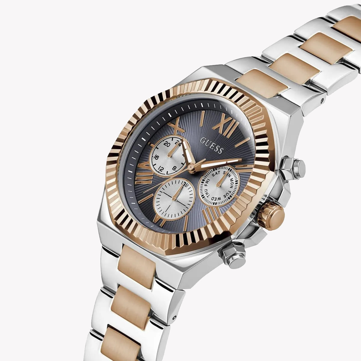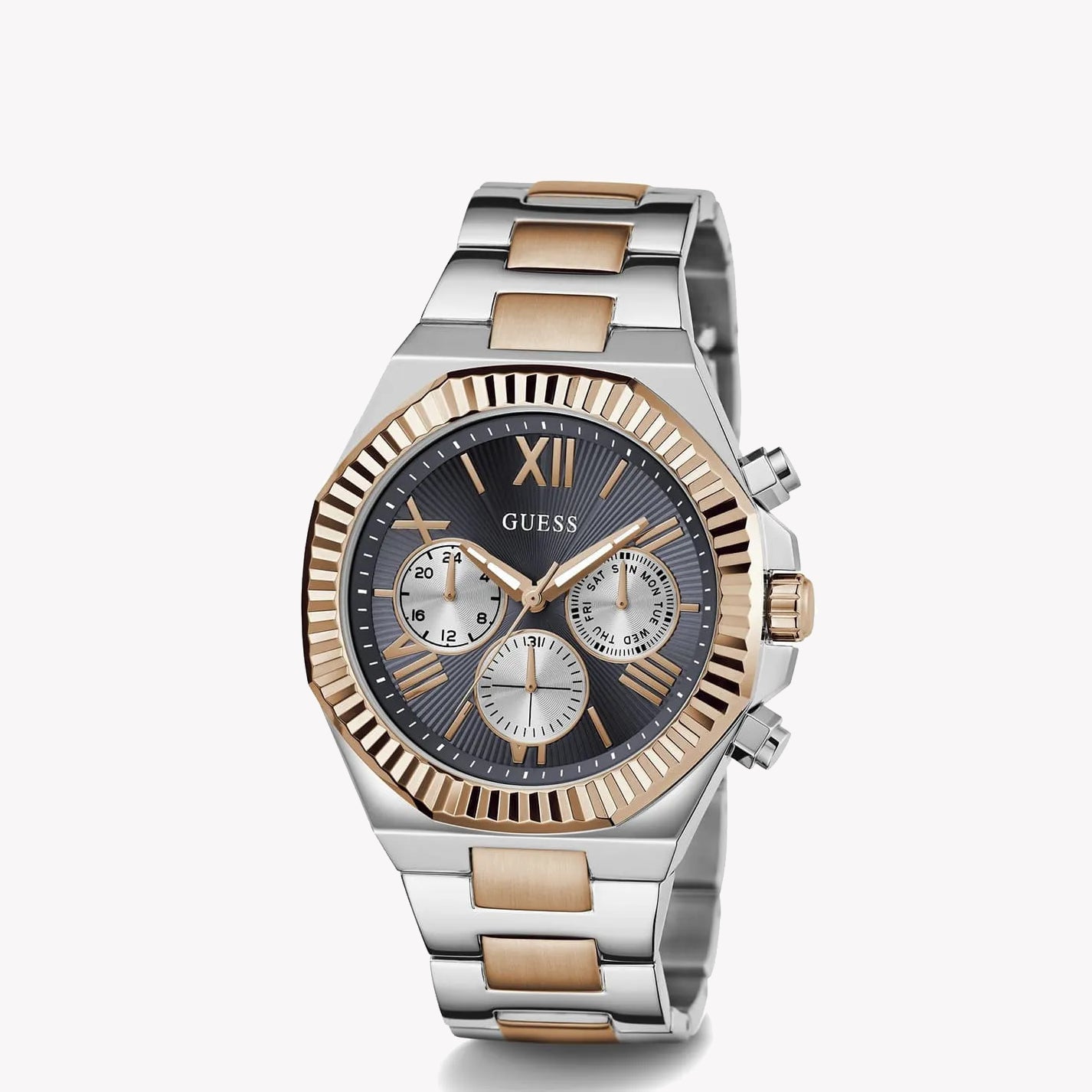 Experience sophistication with the GUESS Men's Quartz Watch GW0703G4. This elegant timepiece features a gold stainless steel band, a striking multicolor dial, and a 44mm case, ensuring style in every moment. With 5 ATM water resistance, it's perfect for any occasion.