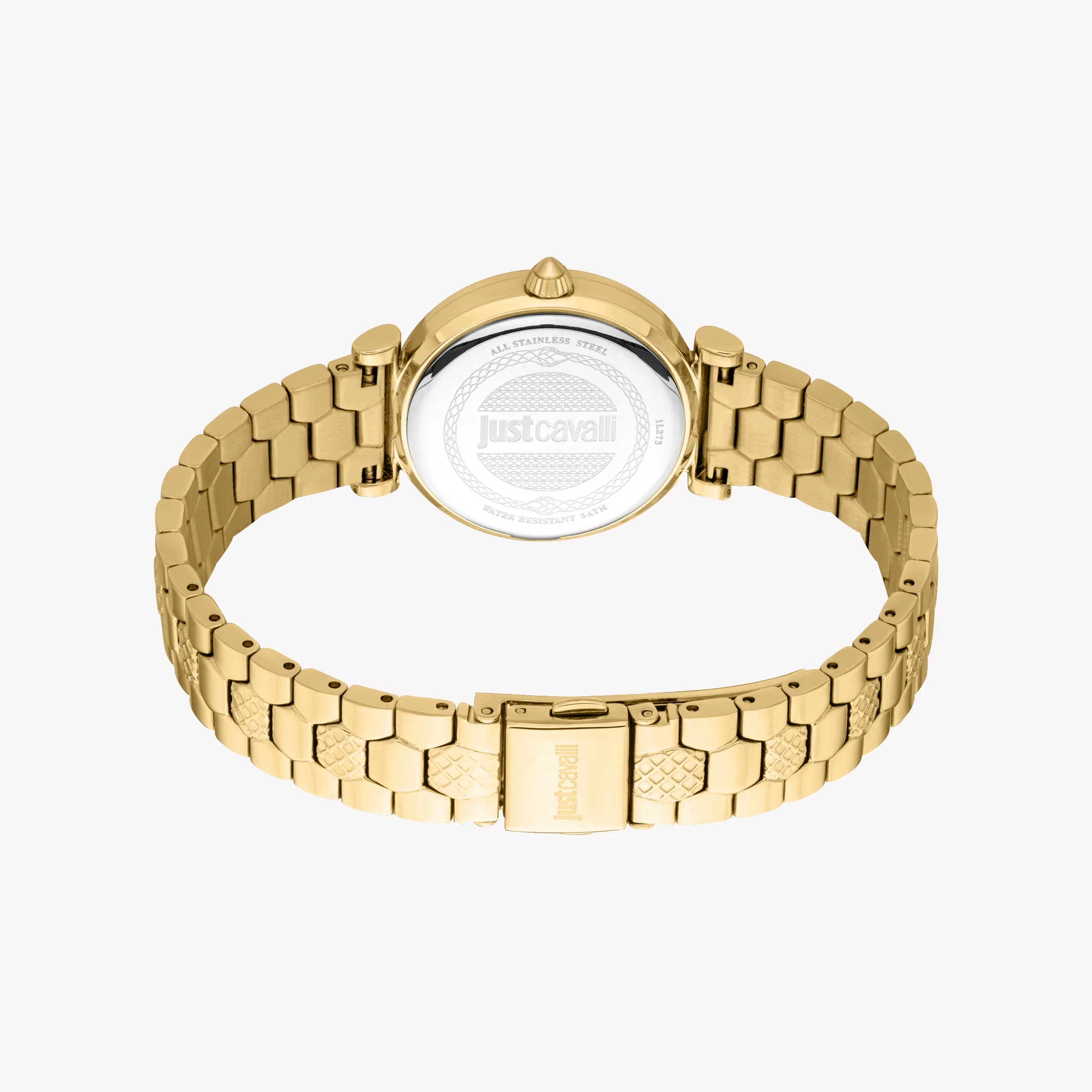 Step into a realm of refined allure with the Just Cavalli Gold Stainless Steel Women's Watch. This stunning piece is designed for those who embody a bold spirit and have a passion for distinctive fashion. The watch showcases a sophisticated Gold Stainless Steel Band that harmoniously blends with a sleek Round Gold Case, measuring 30mm in diameter, creating a striking visual appeal.