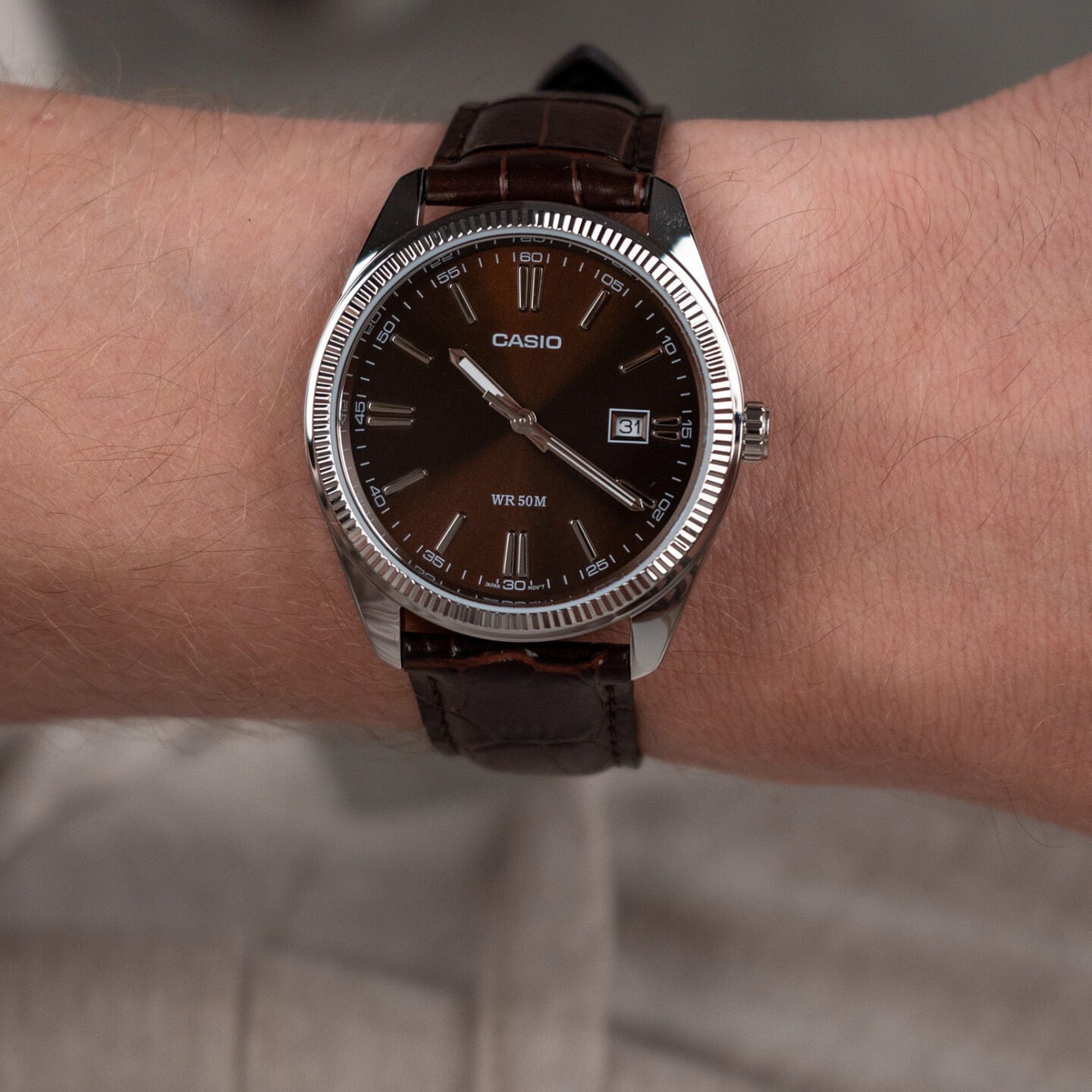 Introducing the Casio MTP-1302PL-5AVEF, an elegant timepiece designed for the modern gentleman. This sophisticated silver dial watch features a robust 38.5mm stainless steel case, a rich brown genuine leather strap, and 5 ATM water resistance. Perfect for any occasion, it’s the ideal blend of style and reliability, ensuring you always look your best. Don’t miss out on this exquisite addition to your accessory collection!