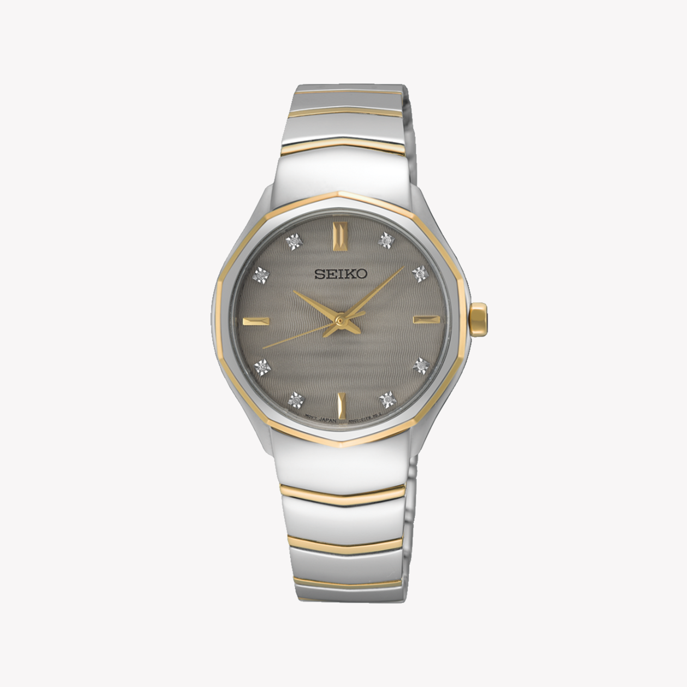 Designed for the modern woman who appreciates both sophistication and practicality, the SEIKO SUR616P1 watch showcases a striking balance between style and substance. With its unique grey dial and eye-catching silver and gold band, this timepiece is more than just an accessory; it's a statement piece that complements a variety of looks, from professional attire to weekend casuals.