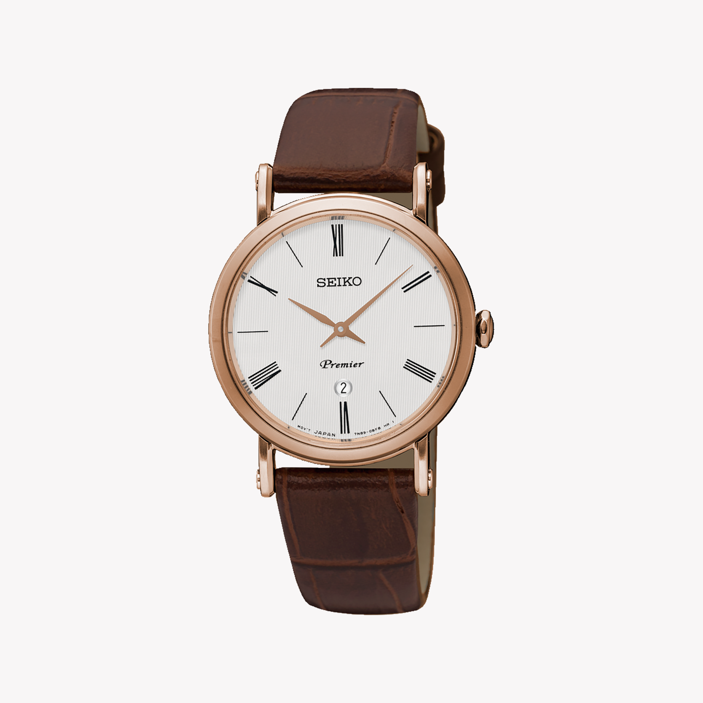 Embrace timeless elegance with the Seiko Presage SXB436P1—a stunning women's watch featuring a rose gold stainless steel case, a chic white dial, and a rich brown leather band. With precise quartz movement and 3 ATM water resistance, this sophisticated timepiece is perfect for every occasion.