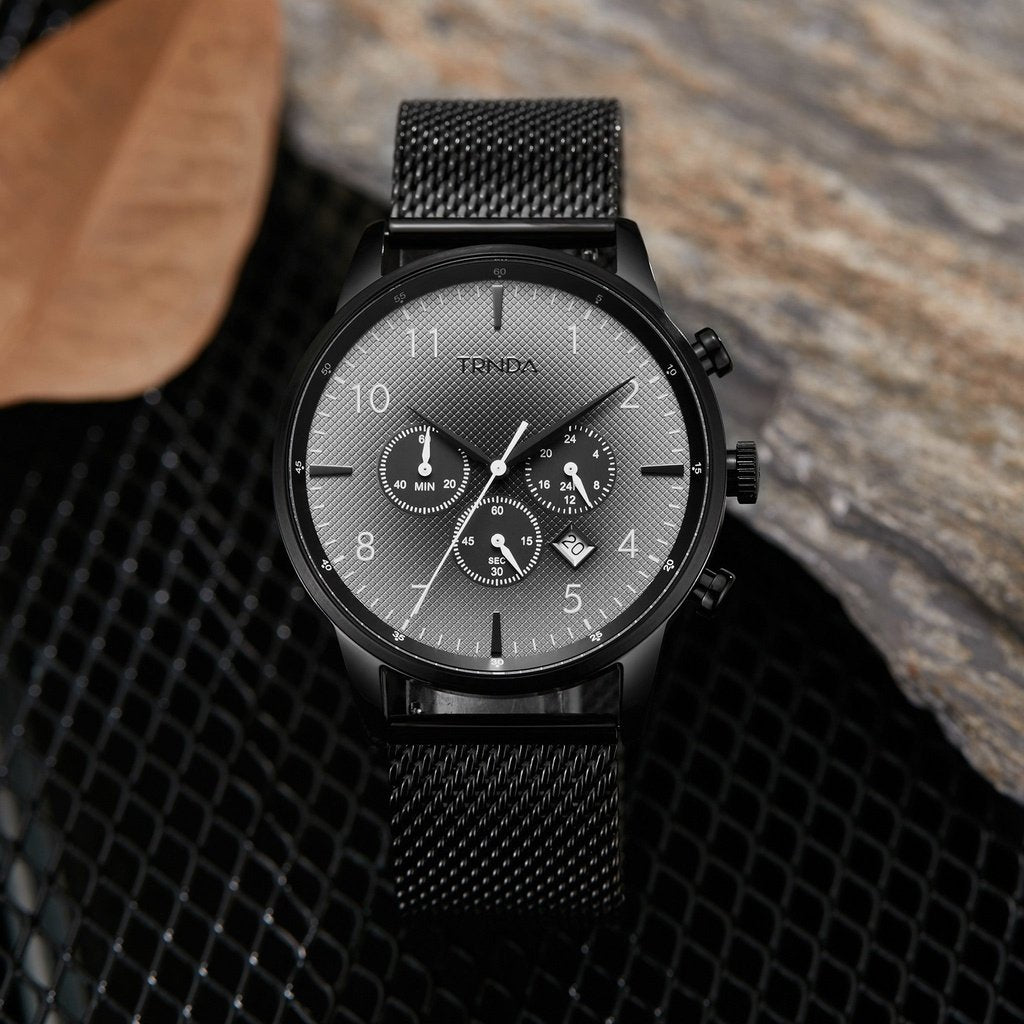 Make a bold impression with the TRNDA Trendy Stainless Steel Men's Watch. Featuring a striking black plated case and a unique gradient steel gray dial, this elegant timepiece is perfect for any occasion. With a durable black mesh stainless-steel band and 3 ATM water resistance, it's both stylish and reliable. Wear it every day and showcase your individuality!