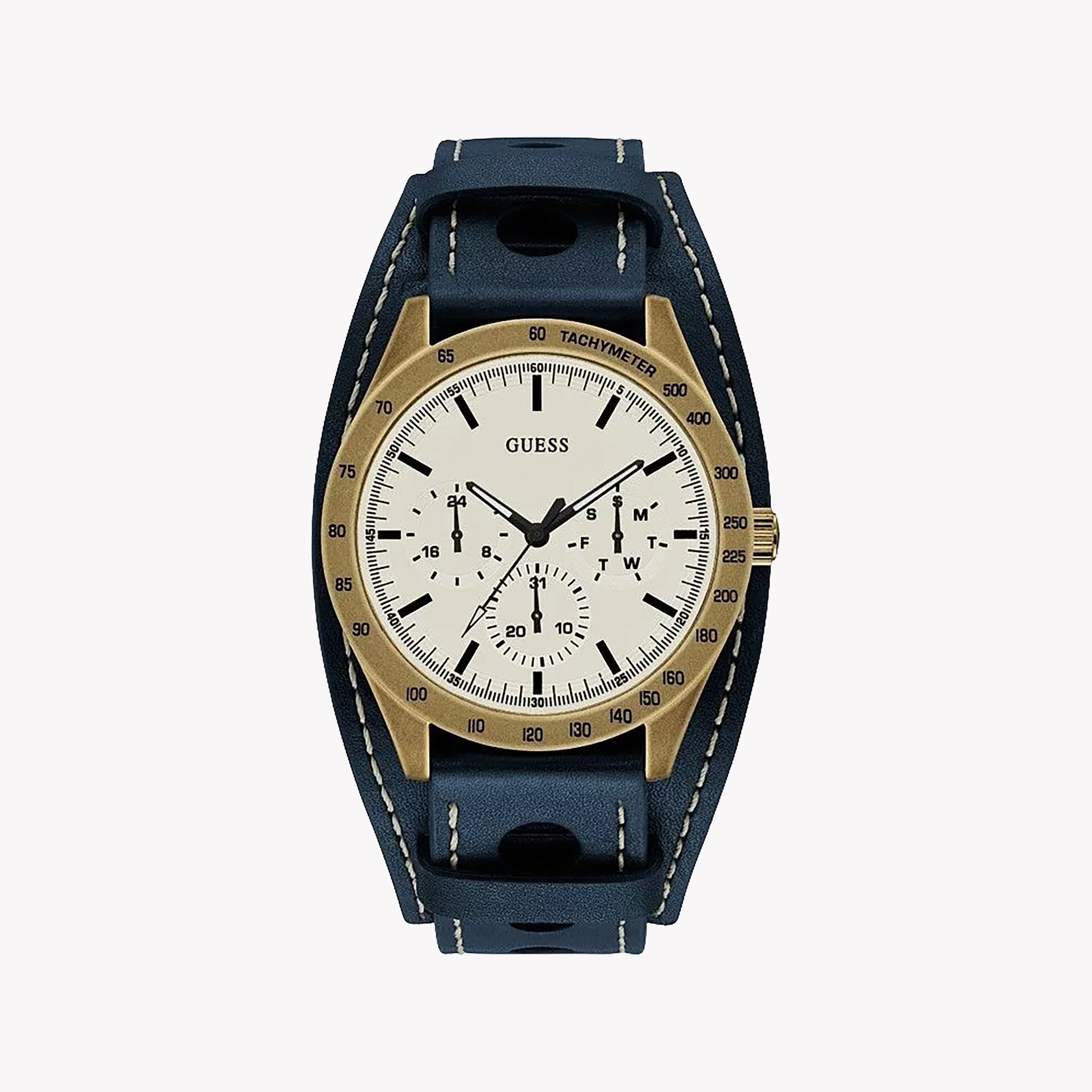 Guess Men's Gold Steel & Blue Leather Watch, White Dial | W1100g2