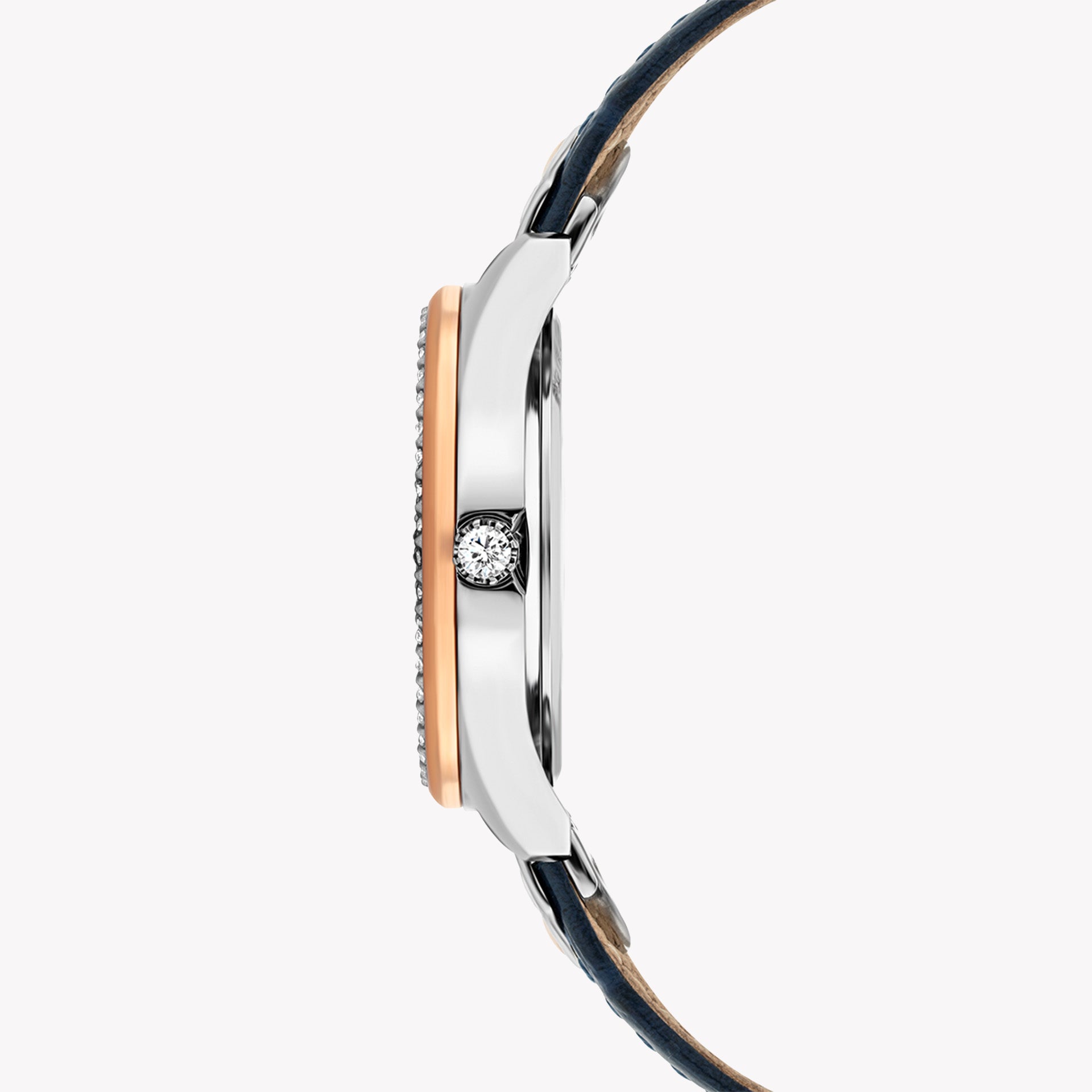 - Striking Aesthetics: The 36 mm stainless steel case in a vibrant blue color exudes sophistication, while the gold leather band provides a warm contrast that captures attention.