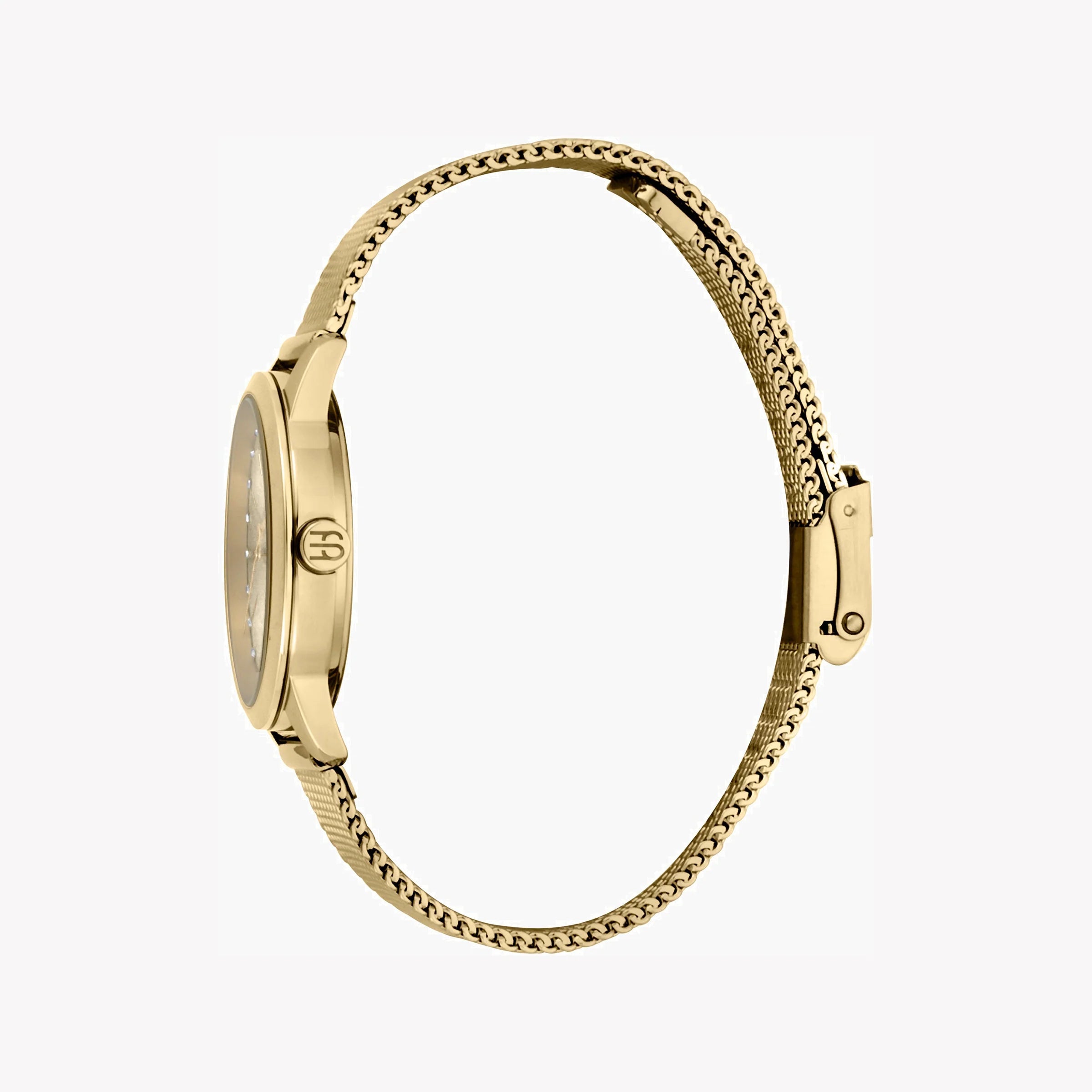 Transform your look with the Esprit Women's watch! Crafted with a stunning Gold Stainless Steel band and a Champagne dial, this elegant timepiece boasts a durable 32mm round case and 5 ATM water resistance. Perfect for any occasion!