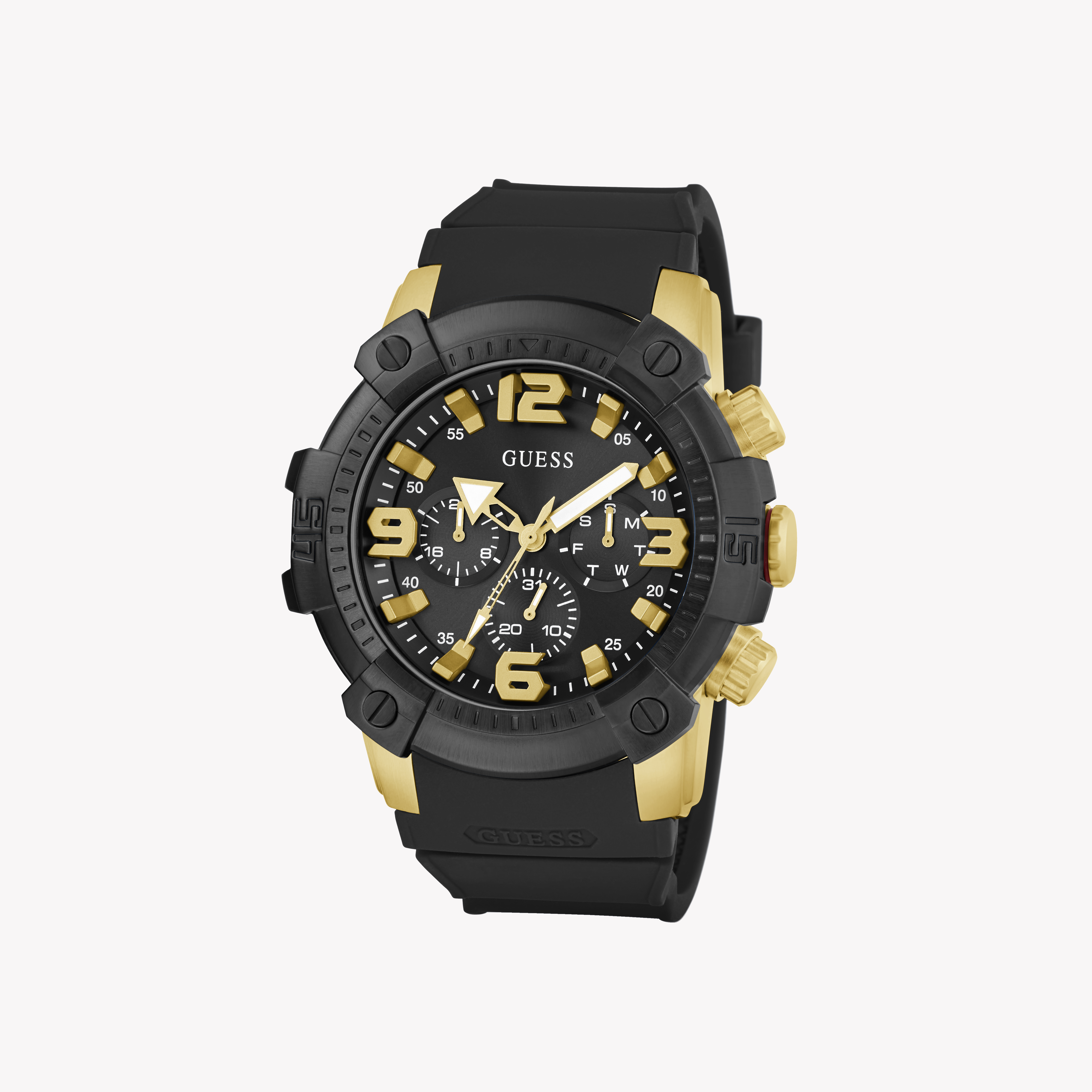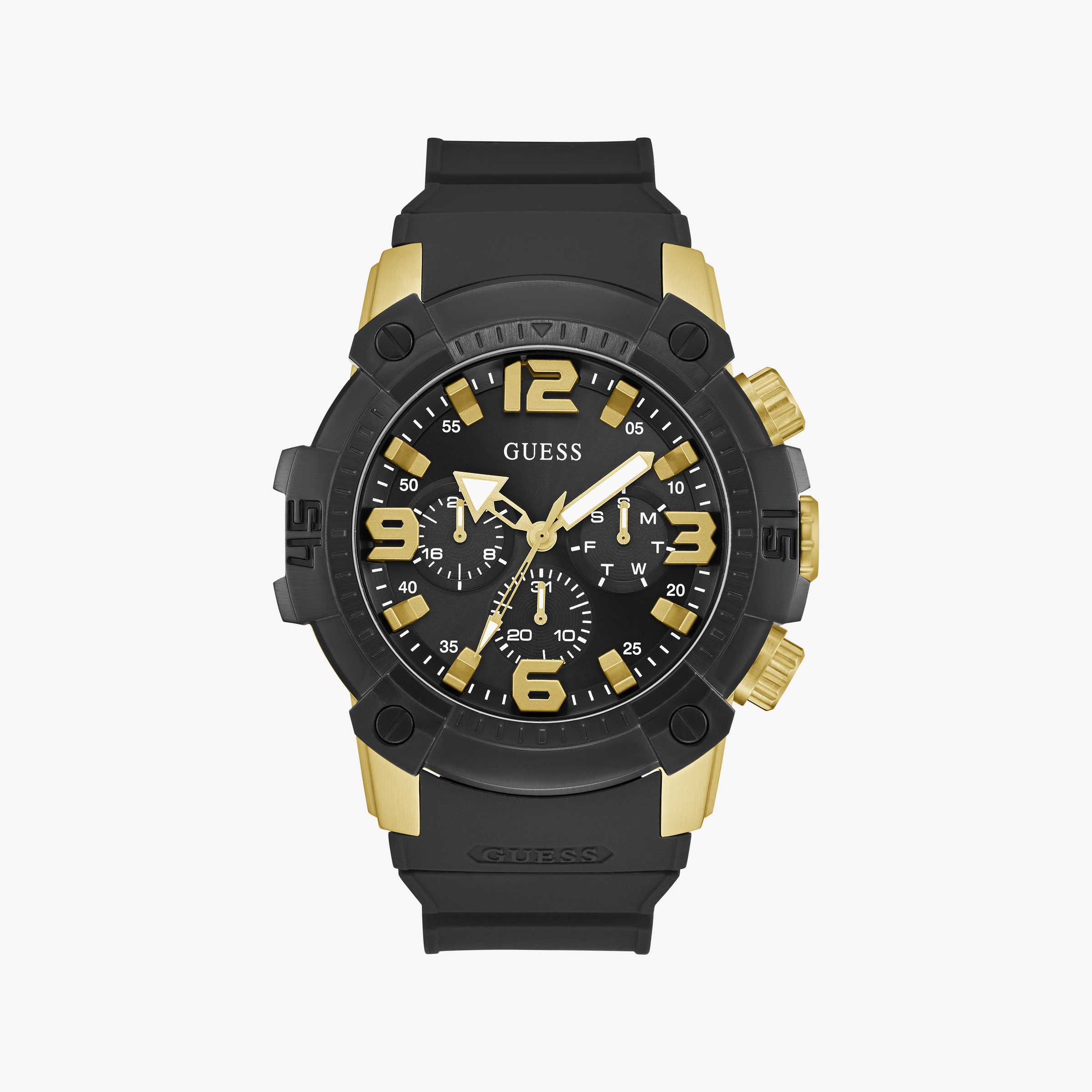 Experience sophistication with the GUESS Men's Quartz GW0911G3 Watch. This elegant timepiece features a captivating gold stainless steel case, a striking black dial, and durable silicone band, all with 5 ATM water resistance—ideal for the modern, stylish man.