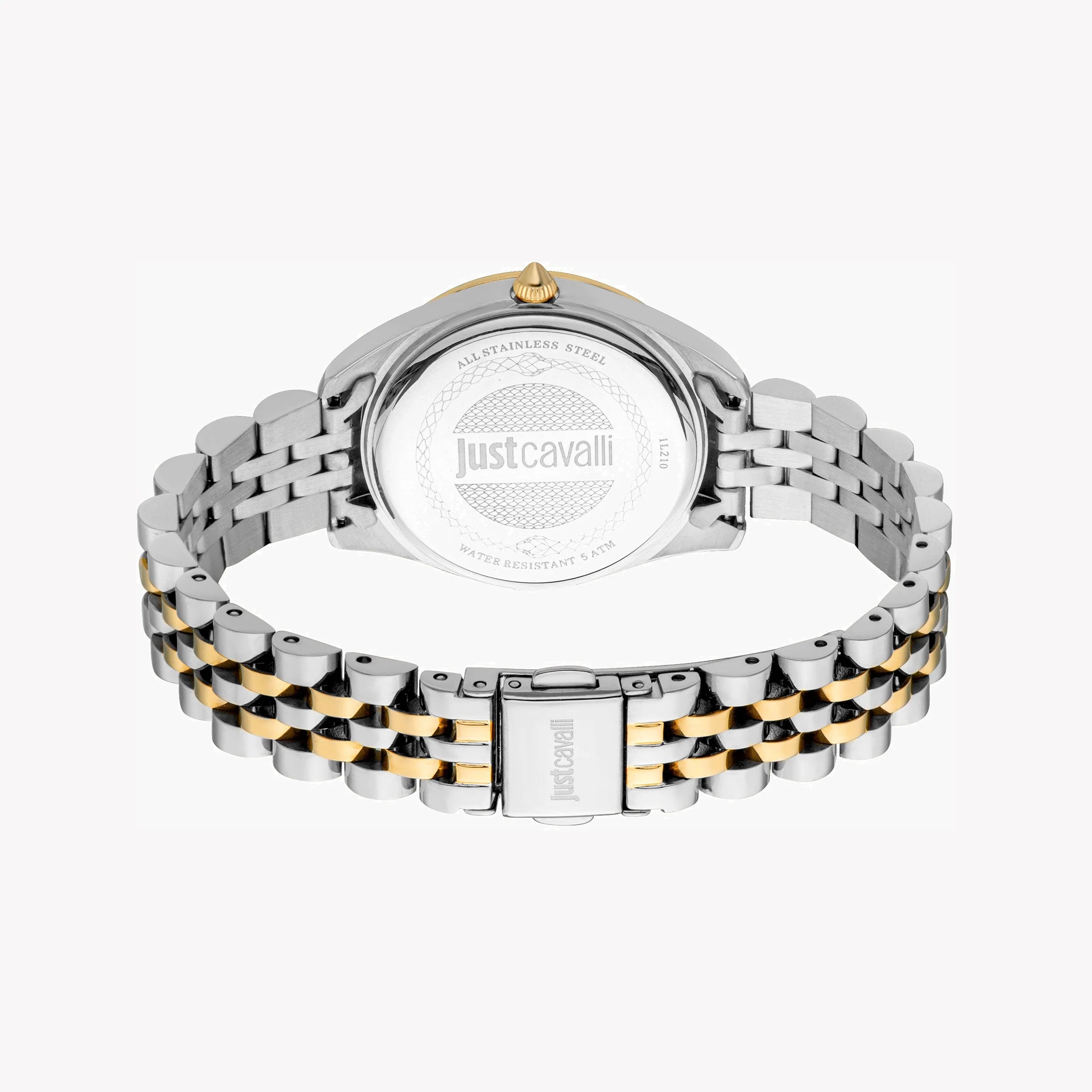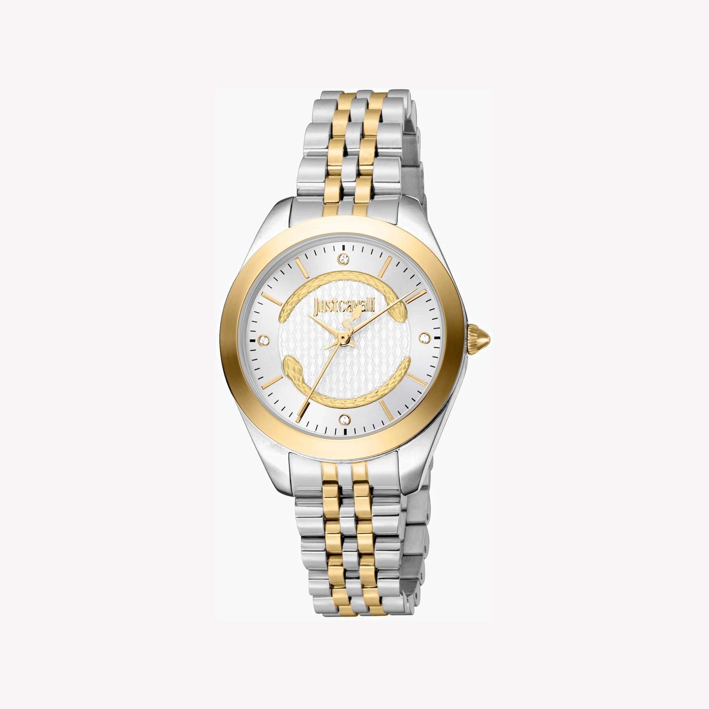 Embrace timeless elegance with the JUST CAVALLI Stainless Steel Women's Watch. Featuring a stunning two-tone silver and gold band, a sleek 32mm round case, and a luminous silver dial, this exquisite timepiece offers sophistication and style. With 5 ATM water resistance, it’s perfect for the modern woman who values both fashion and function.