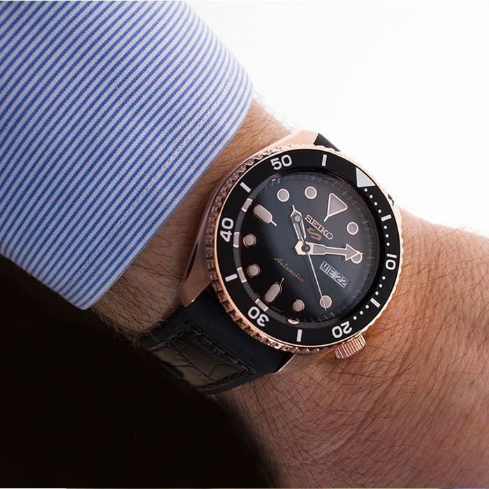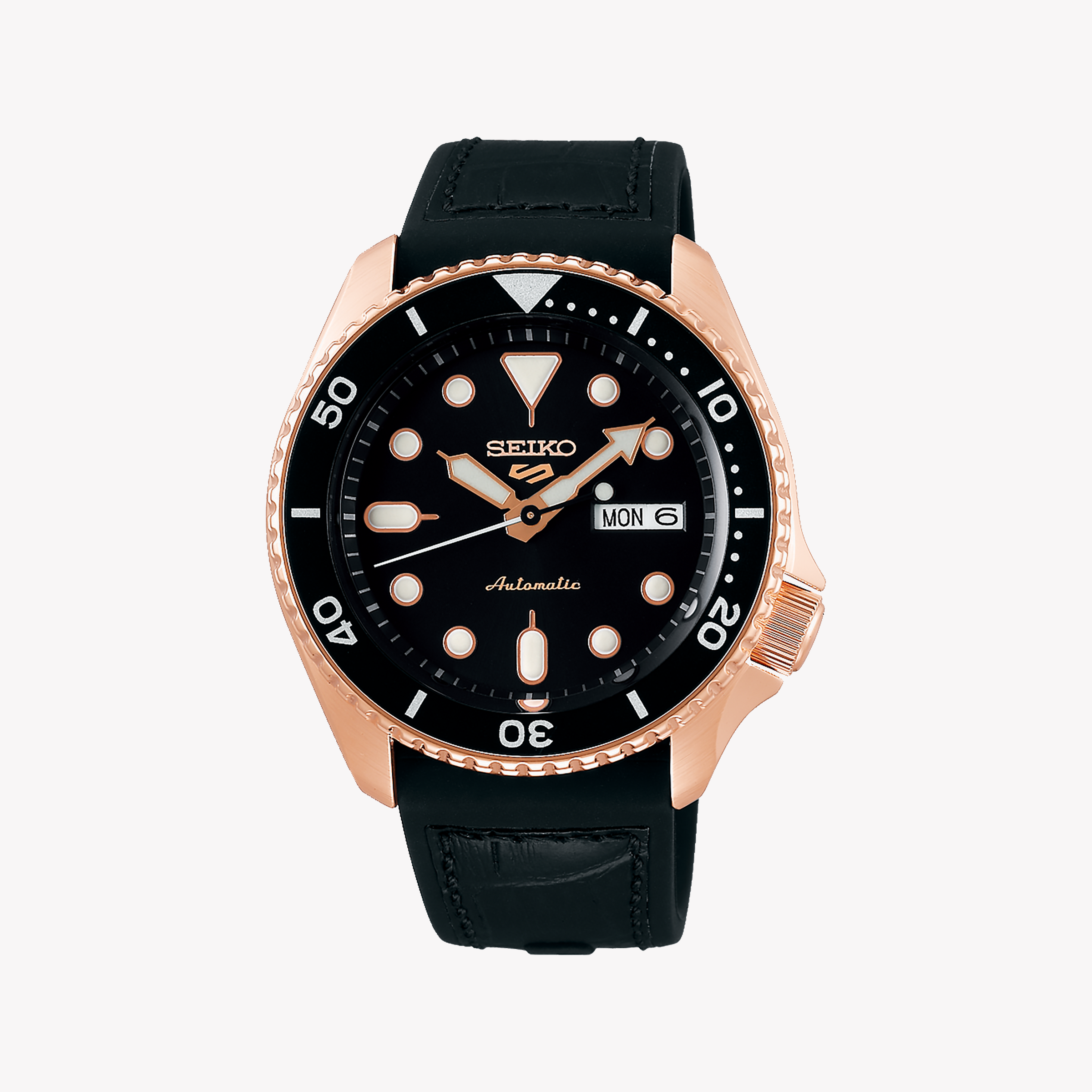 Experience unmatched elegance with the SEIKO 5 SRPD76K1, a striking men's watch featuring a stunning rose gold case and bold black silicone band. Perfect for the dynamic man, this automatic timepiece combines style and precision, making it a must-have accessory for any occasion. With its sophisticated all-black dial and robust 10 ATM water resistance, it seamlessly transitions from office to adventure. Stand out with this exquisite, reliable timepiece that speaks to your refined taste.