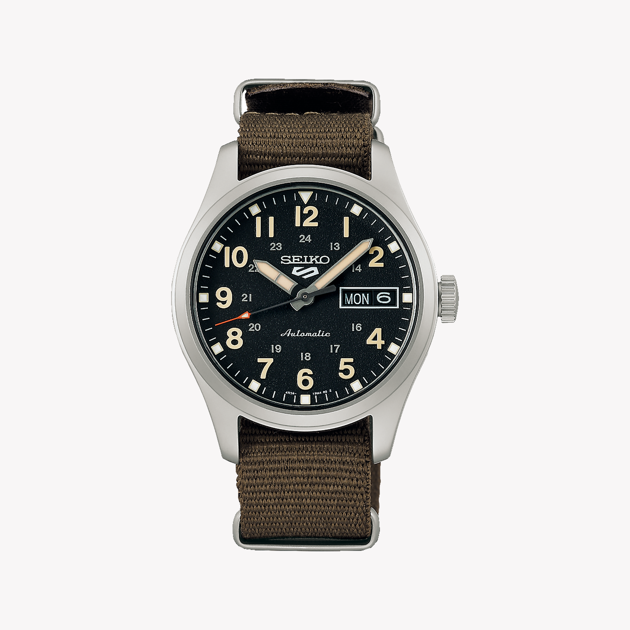 Meet the SEIKO 5 SRPJ85K1: a modern unisex watch with a sleek silver stainless steel case, rugged brown fabric band, and bold black dial. Automatic movement and 10 ATM water resistance make this elegant timepiece a must-have!