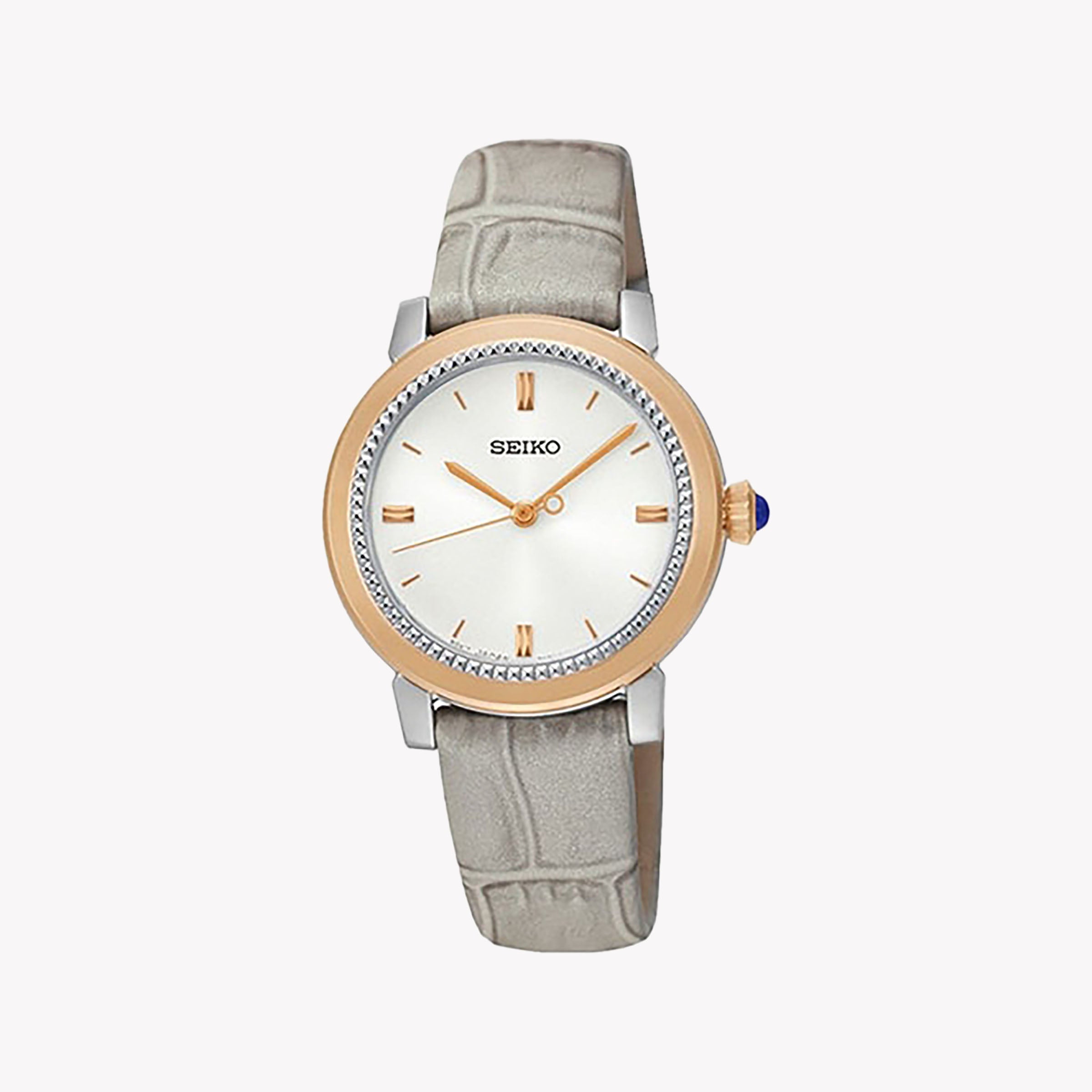 Indulge in elegance with the SEIKO Women's Rose Gold Quartz Watch SRZ452P1. This chic timepiece features a stunning rose gold stainless steel case, a crisp white dial, and 5 ATM water resistance. Perfect for the sophisticated woman!