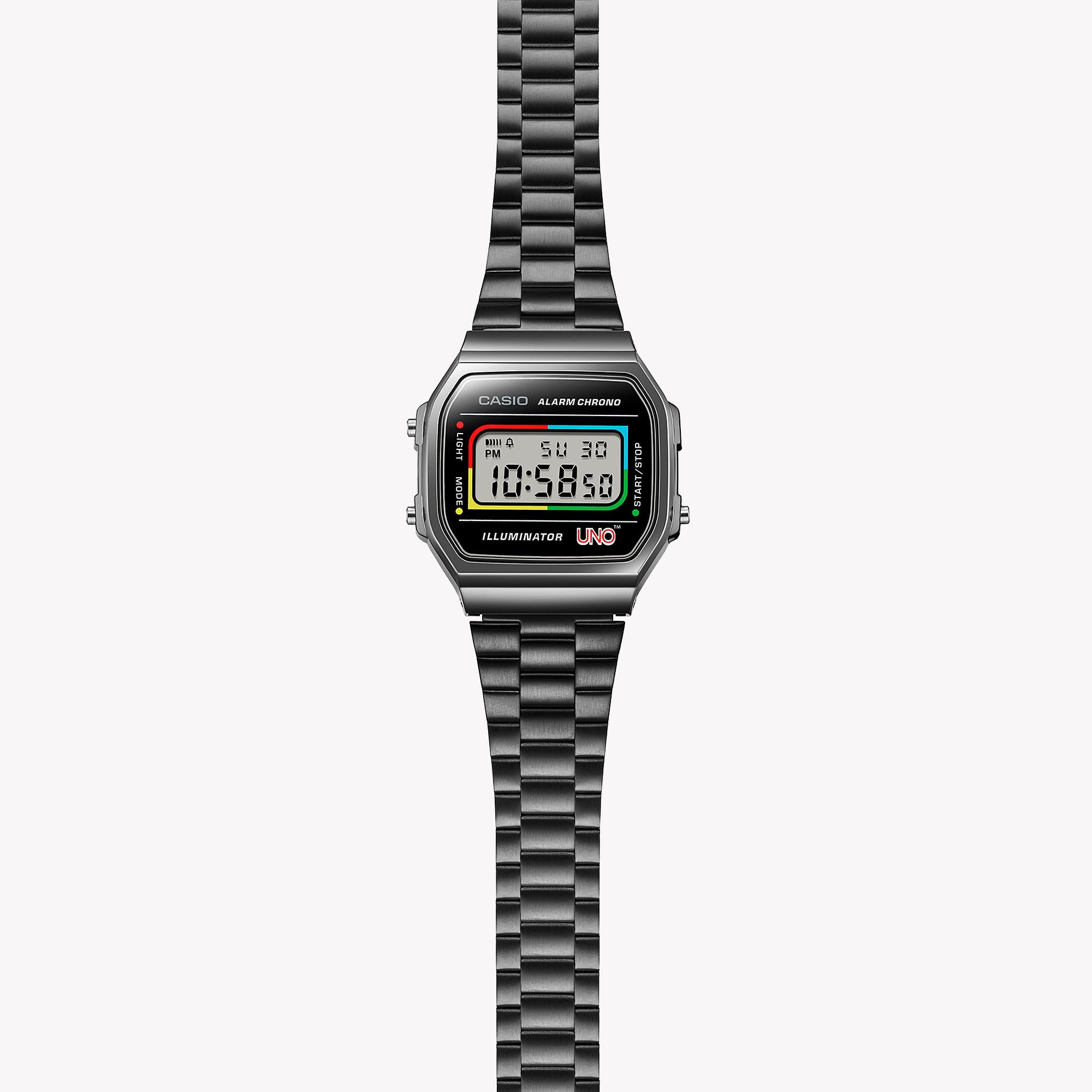 The Casio A168WEUC-1A is more than just a watch; it's a celebration of modern design and classic aesthetics. Inspired by the iconic UNO™ card game, this digital timepiece offers a unique twist on a familiar favorite.