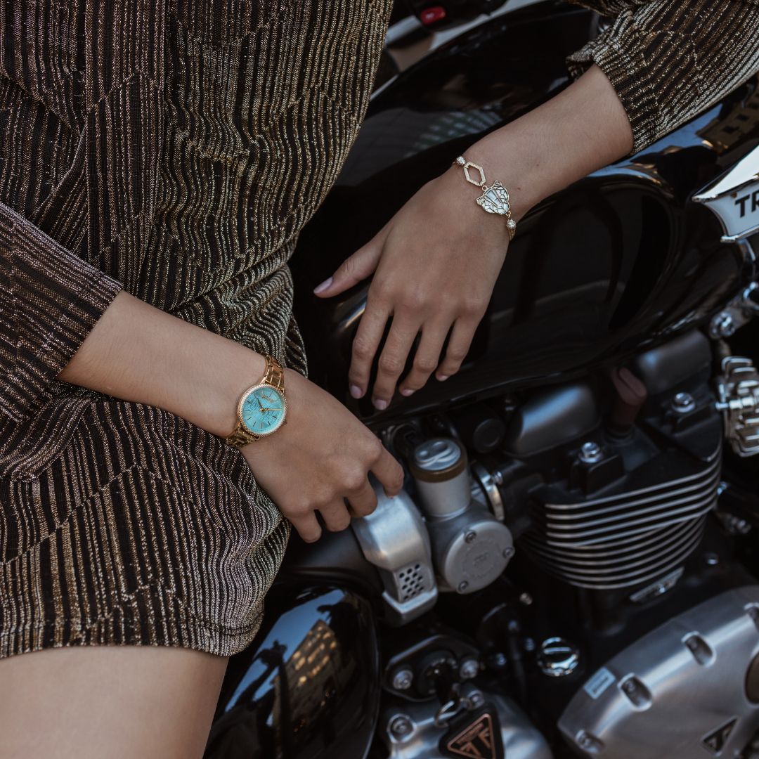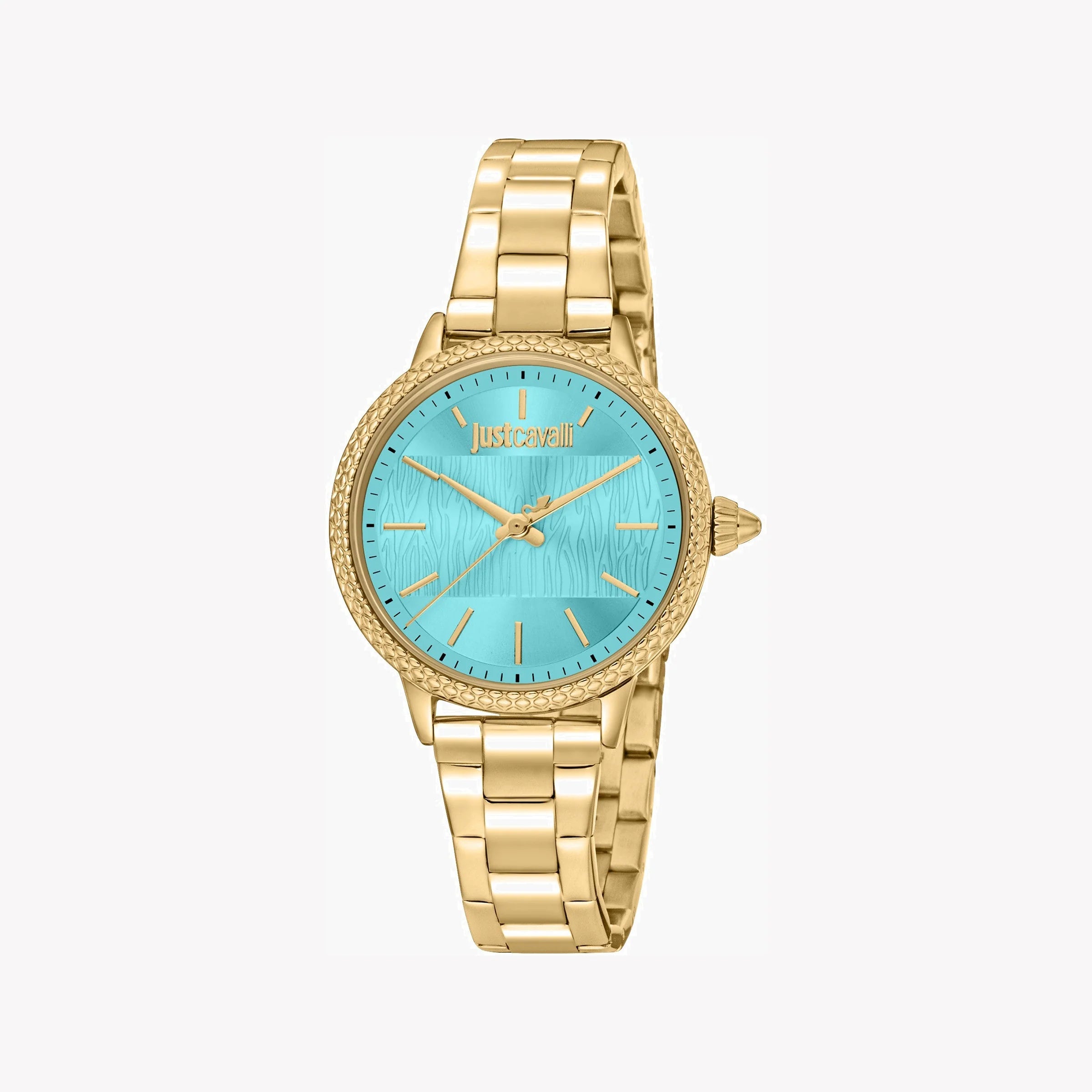 Timeless, sophisticated, elegant. This Just Cavalli Women's Watch has it all. From the Gold Stainless Steel Band to the Stainless Steel Round Gold Case of 32 mm diameter and of course the elegant Turquoise Dial, this watch is the perfect representation of the ultimate sophistication.