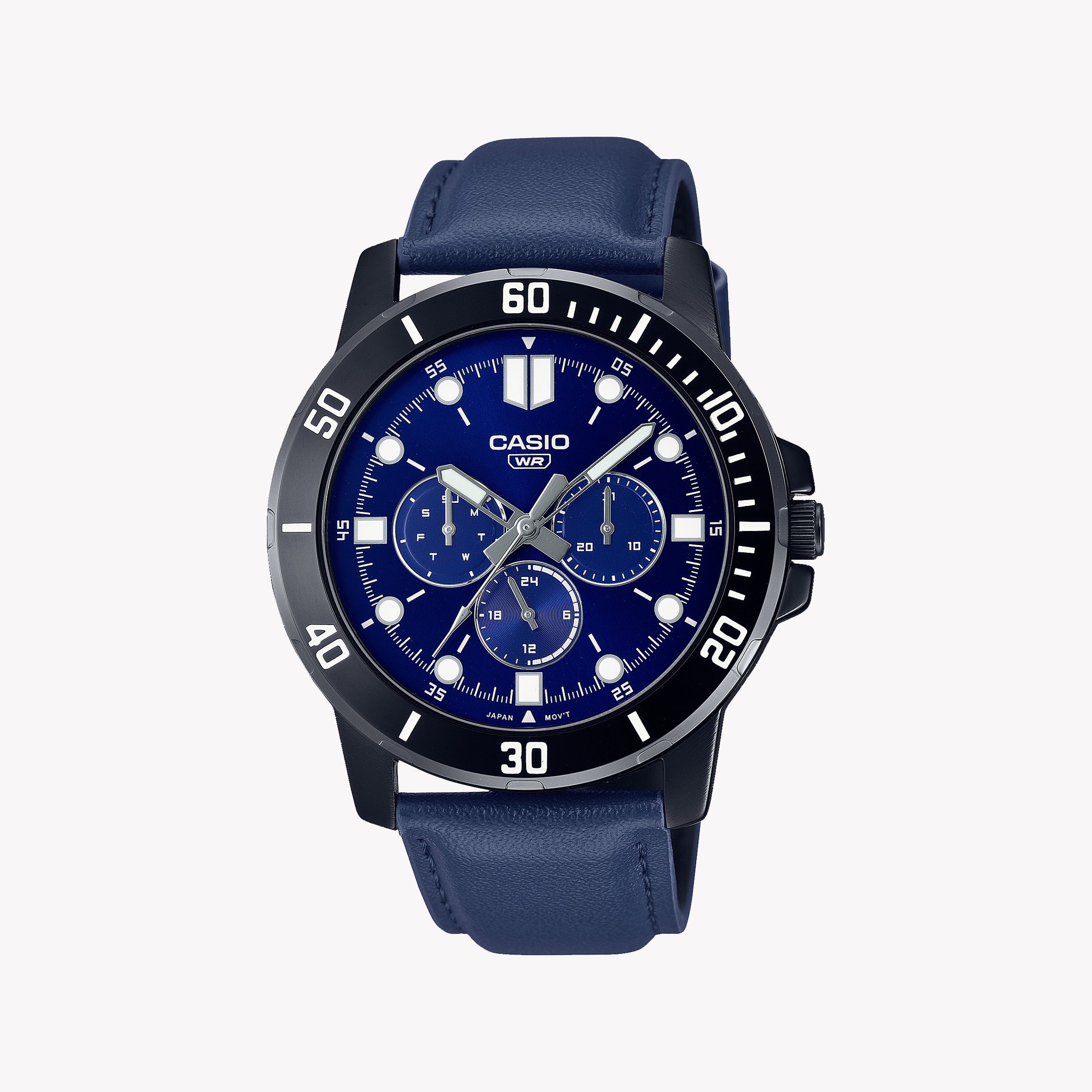 Step into sporty sophistication with the Casio MTP-VD300BL-2EUDF, a watch that makes a bold statement of confidence every time you wear it.