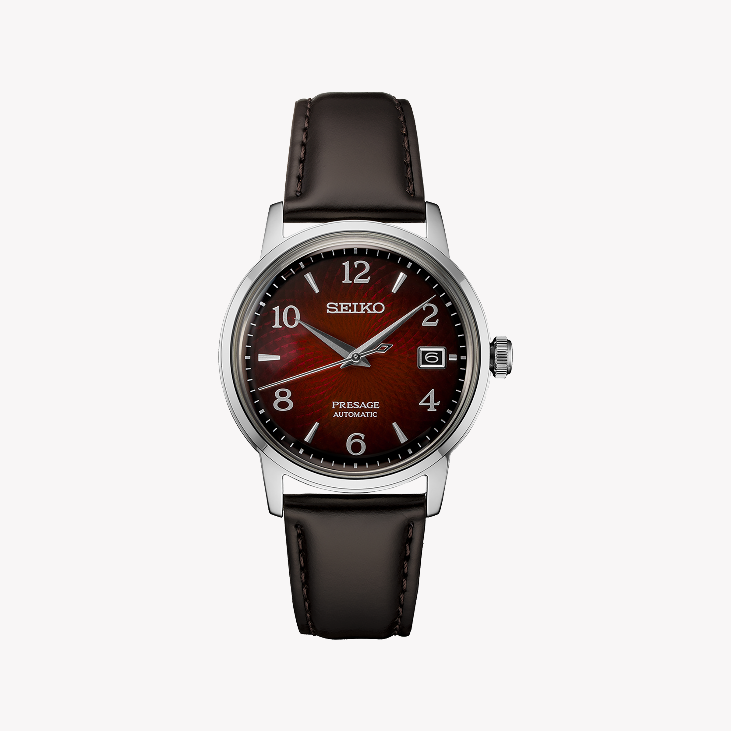 Introducing the SEIKO SRPE41J1, the ultimate elegant timepiece for the modern man. With its striking dark red dial, sleek stainless steel case, and durable dark brown leather band, this automatic watch is the perfect blend of sophistication and functionality. Enjoy reliable 5 ATM water resistance and precise timekeeping that enhances your style for any occasion. Make a statement wherever life takes you!